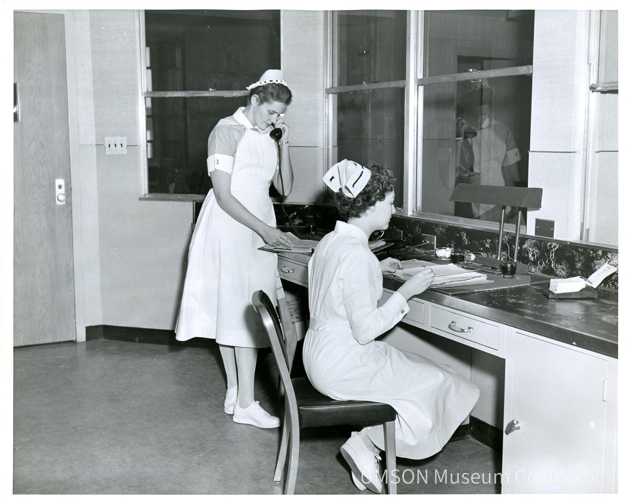 Senior nursing student in short-sleeved striped uniform and apron stands while on the phone, discussing a patient chart, while an RN in a white uniform and cap with a black stripe reads a notebook on the desk. 8" x 10" black and white photographic print.Acquisition