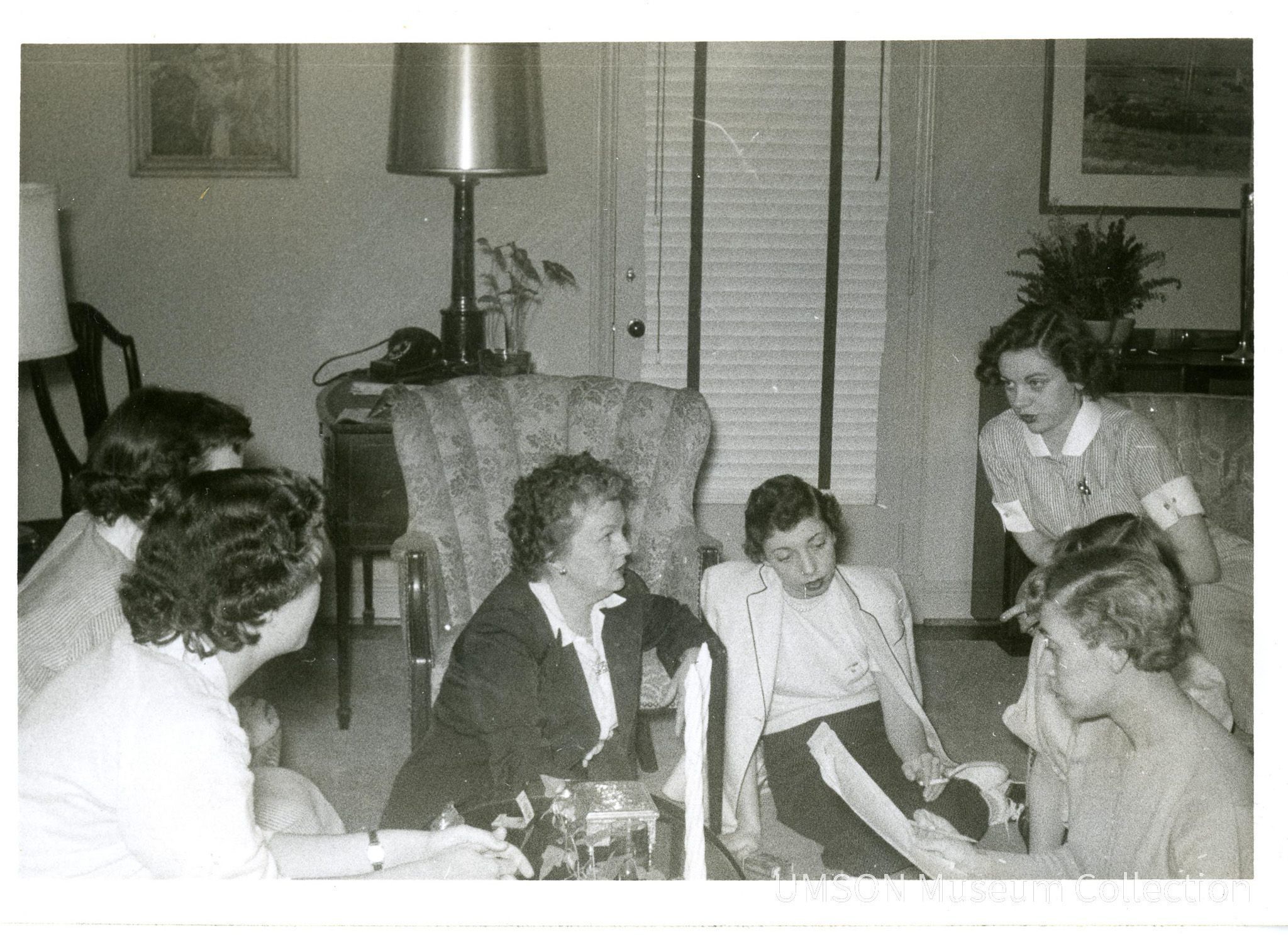 Six young women (nursing students) seated around house mother in the living room of Parsons Hall (Nurses Home), University Hospital. Two are wearing short-sleeved striped uniforms, the others are in street clothes. House mothers took turns playing hostess. Male visitors were only allowed in the living room. 5" x 7" black and white photographic print.Acquisition