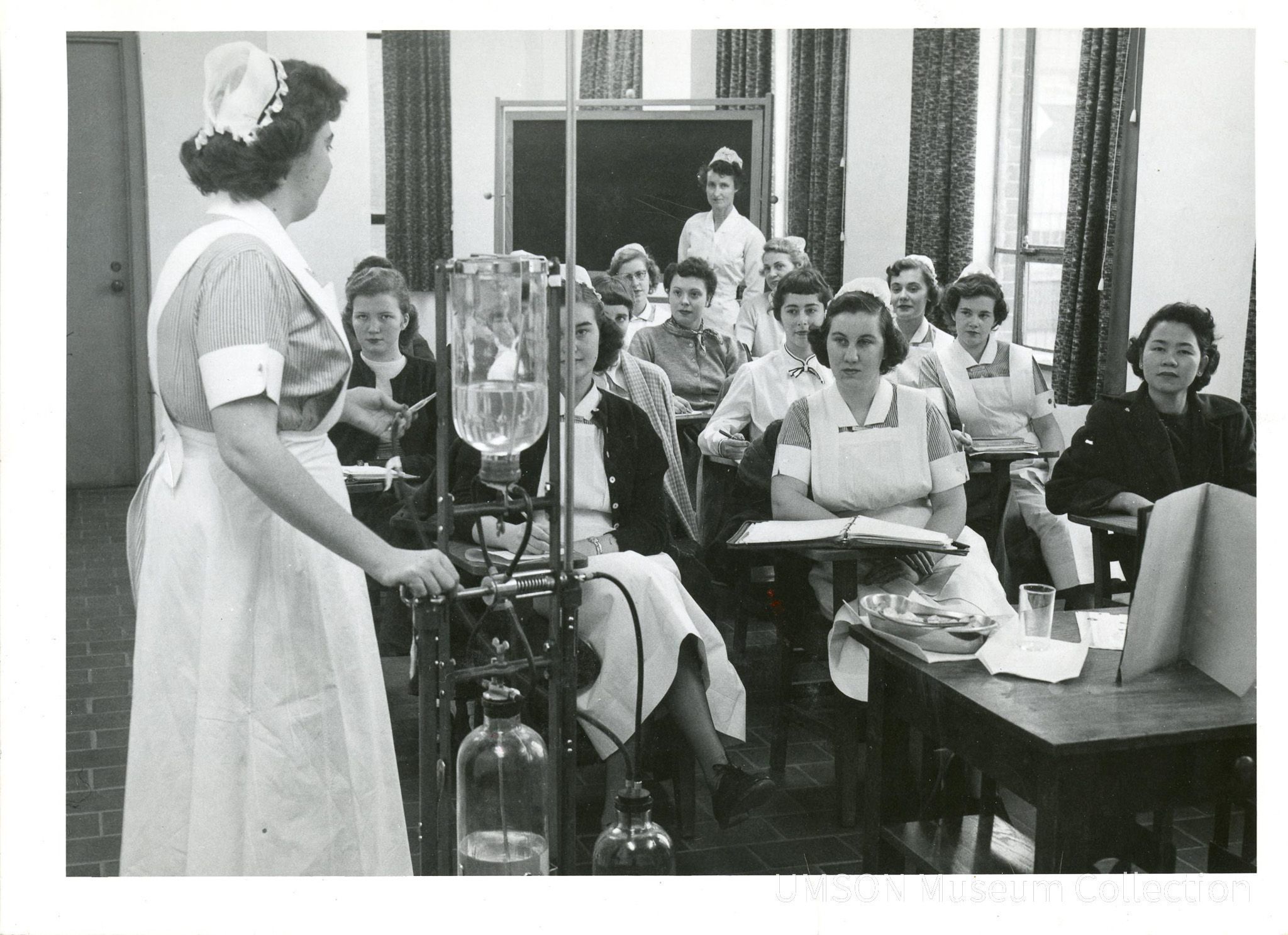 Senior nursing student stands near a Wangensteen suction apparatus (two glass bottles, one inverted, on a stand, with rubber tubes) at the front of a classroom of junior nursing students. A graduate nurse instructor stands at the back of the room. The Wangensteen suction apparatus is a modified siphon that maintains a constant negative pressure to remove gases and fluids from the stomach and intestines after surgery or other injury. 5" x 7" black and white photographic print.Acquisition