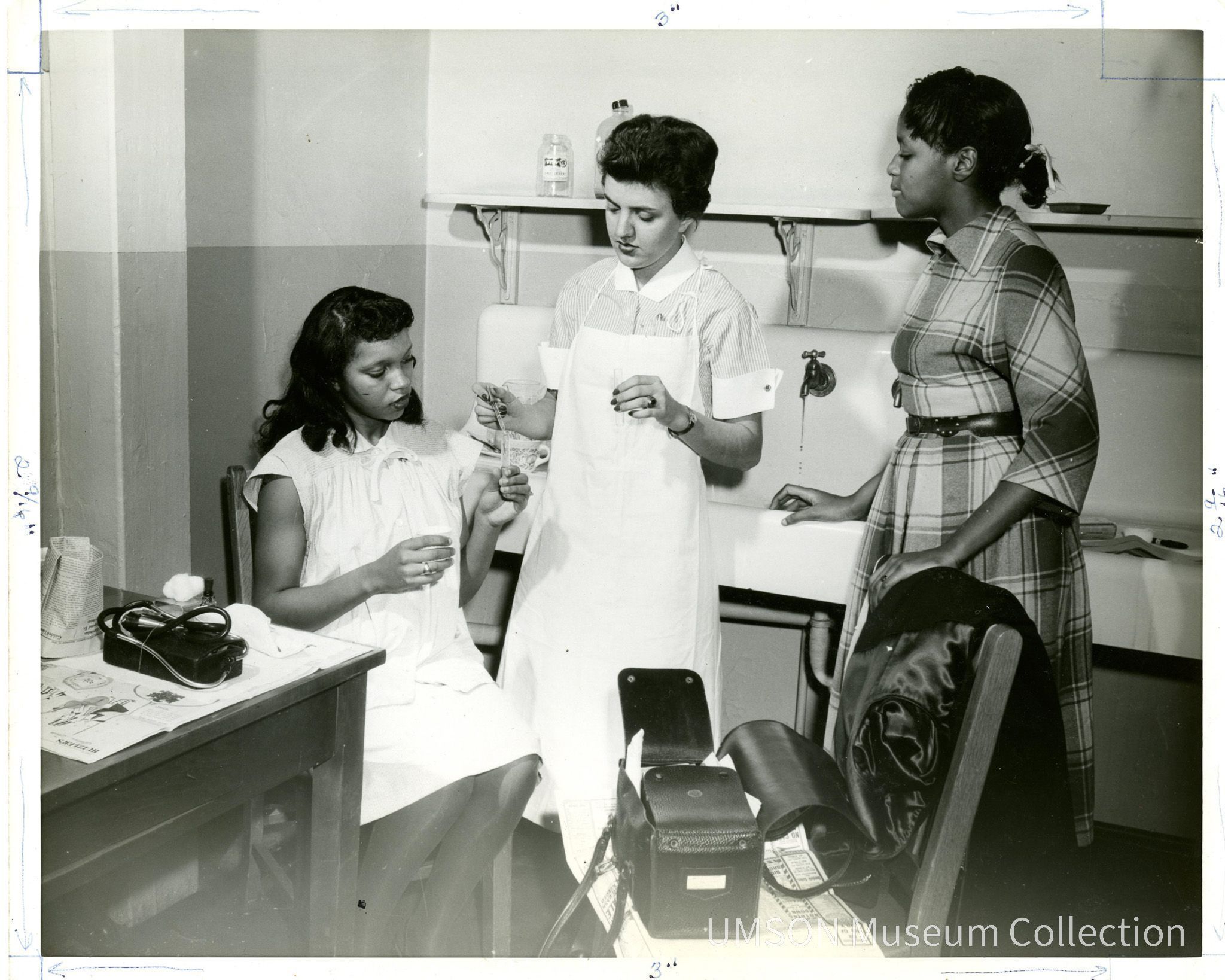 Nursing student in short-sleeved uniform and large white apron stands in front of a white enamel kitchen sink while adding liquid from a dropper to a test tube held by a seated patient in a night gown. Newspaper is spread on the kitchen table and chair underneath the student's bag, instrument tray, and stethoscope. A woman in a plaid dress stands at left, watching the other two women. 8" x 10" black and white photographic print.Acquisition