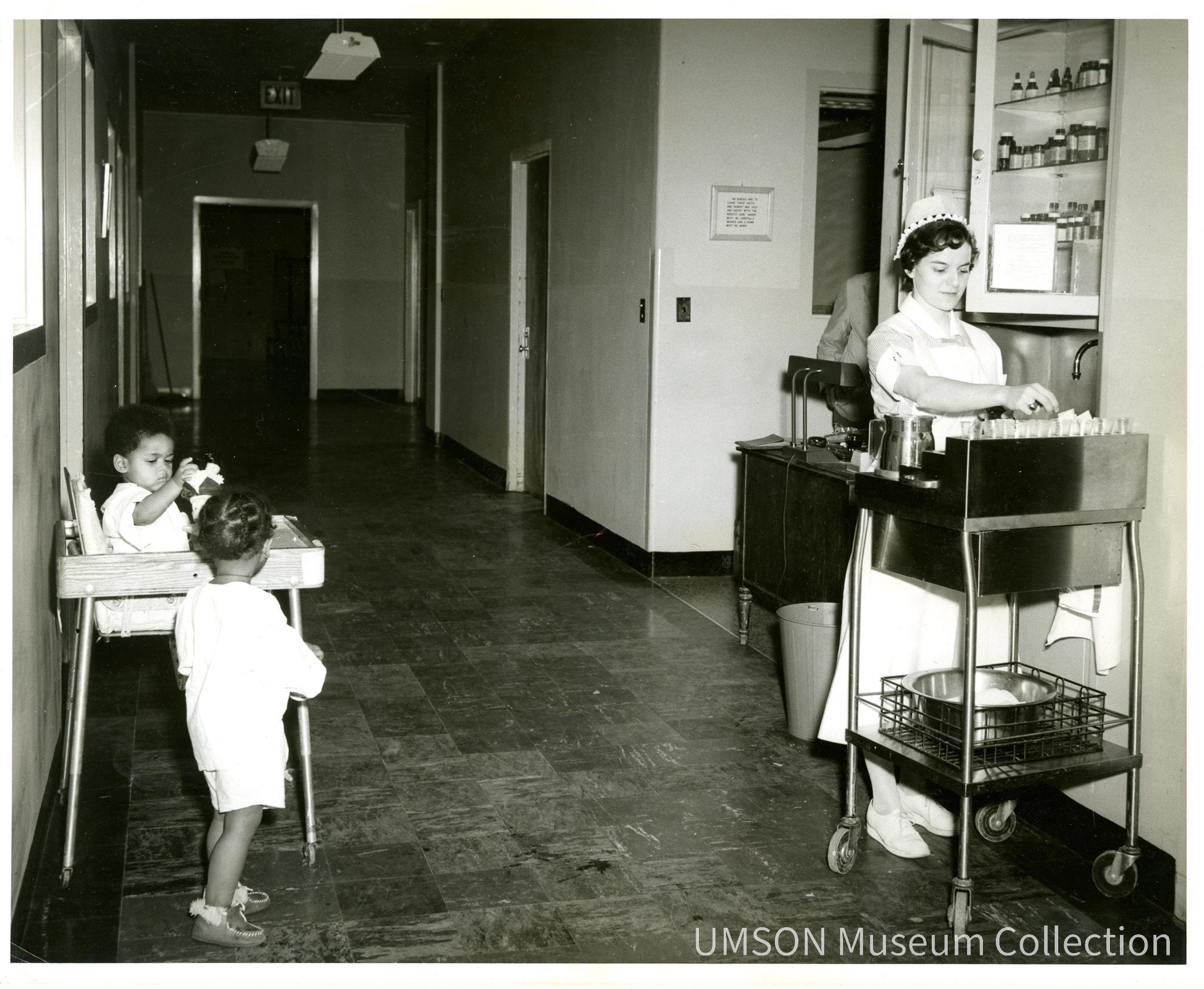 Senior student nurse sorts medications into cups on a stainless steel cart at the pharmacy cabinet on the pediatric ward, University Hospital. Two Black toddlers are at left, one in a chair and tray, the other standing next to the chair. 8" x 10" black and white photographic print.Acquisition