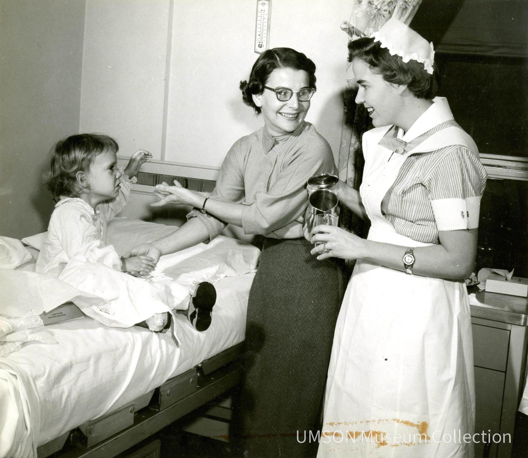 Junior student nurse in short-sleeved striped uniform with white apron and cap pours water into a glass as she talks with a mother and her toddler. The toddler is sitting on an exam table, and holds her mother's hand. (The student is also seen in 2023.11.21) 6.25" x 7.125" black and white photographic print.Acquisition