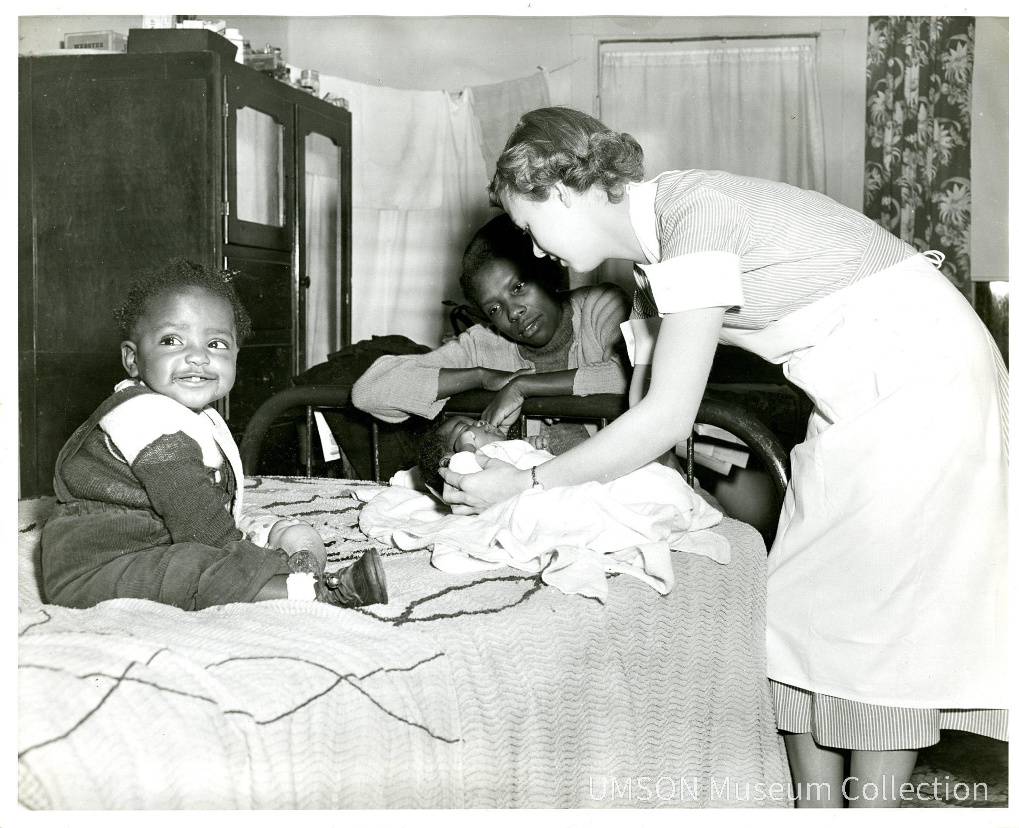 Student nurse in short-sleeved striped uniform with white apron examines an infant placed on a bed; at left, the infant's toddler sibling smiles, while their mother looks adoringly over the foot of the bed. They are in the mother's bedroom. (May be the same student seen in 2023.11.21 and 2023.11.23) 8" x 10" black and white photographic print.Acquisition