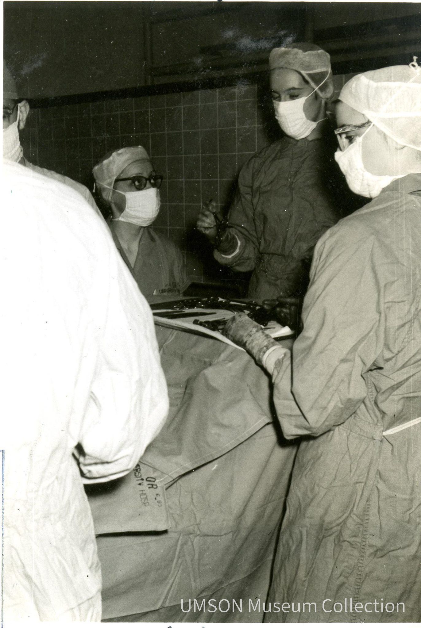Student nurse assisting surgeon in operating room, University HospitalEntry/Object ID