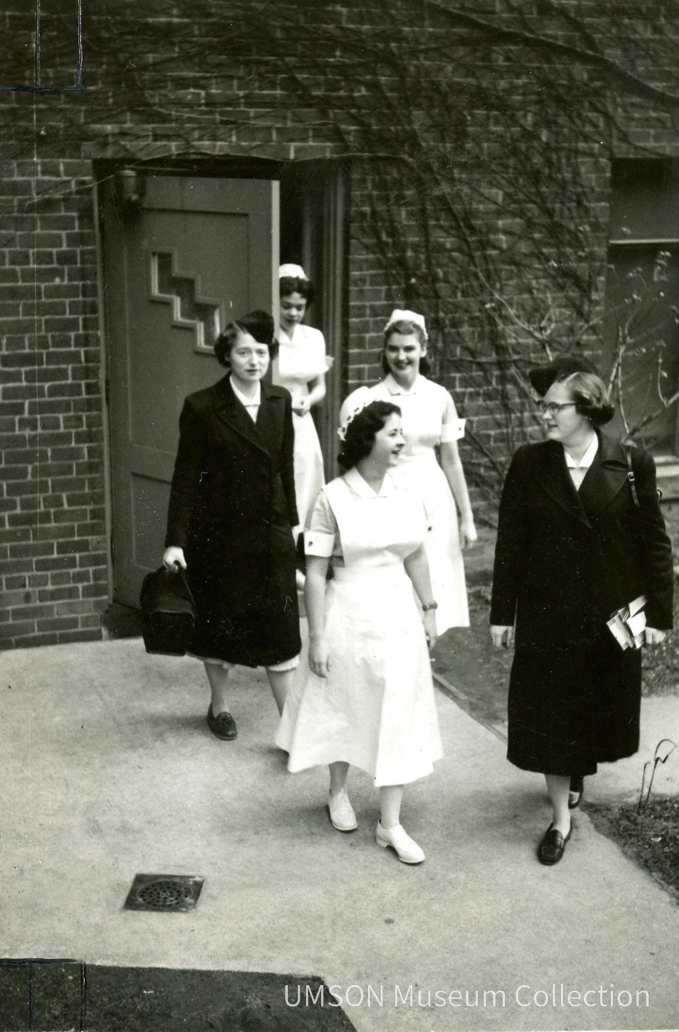 Five nursing students, two in public health uniform coats, are seen from above as they leave the ivy-covered Parsons Hall on their way to class or rounds. 4.5" x 3" black and white snapshot.Acquisition