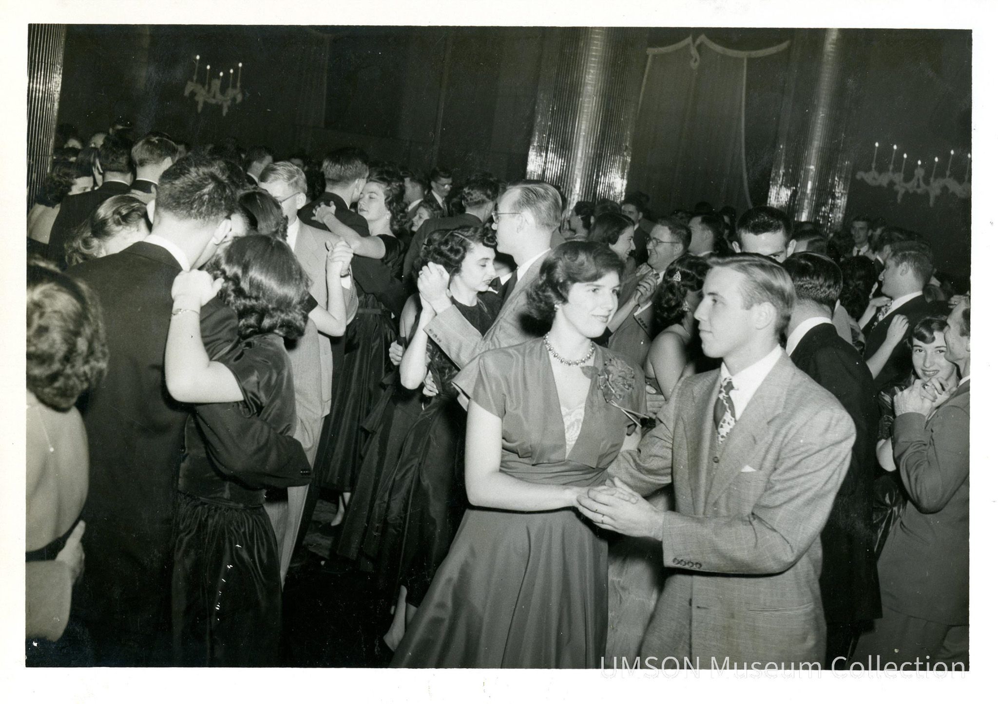 Couples in suits and dresses crowd the dance floor of a ballroom for a University of Maryland, Baltimore school dance. 5" x 7" black and white photographic print.Acquisition