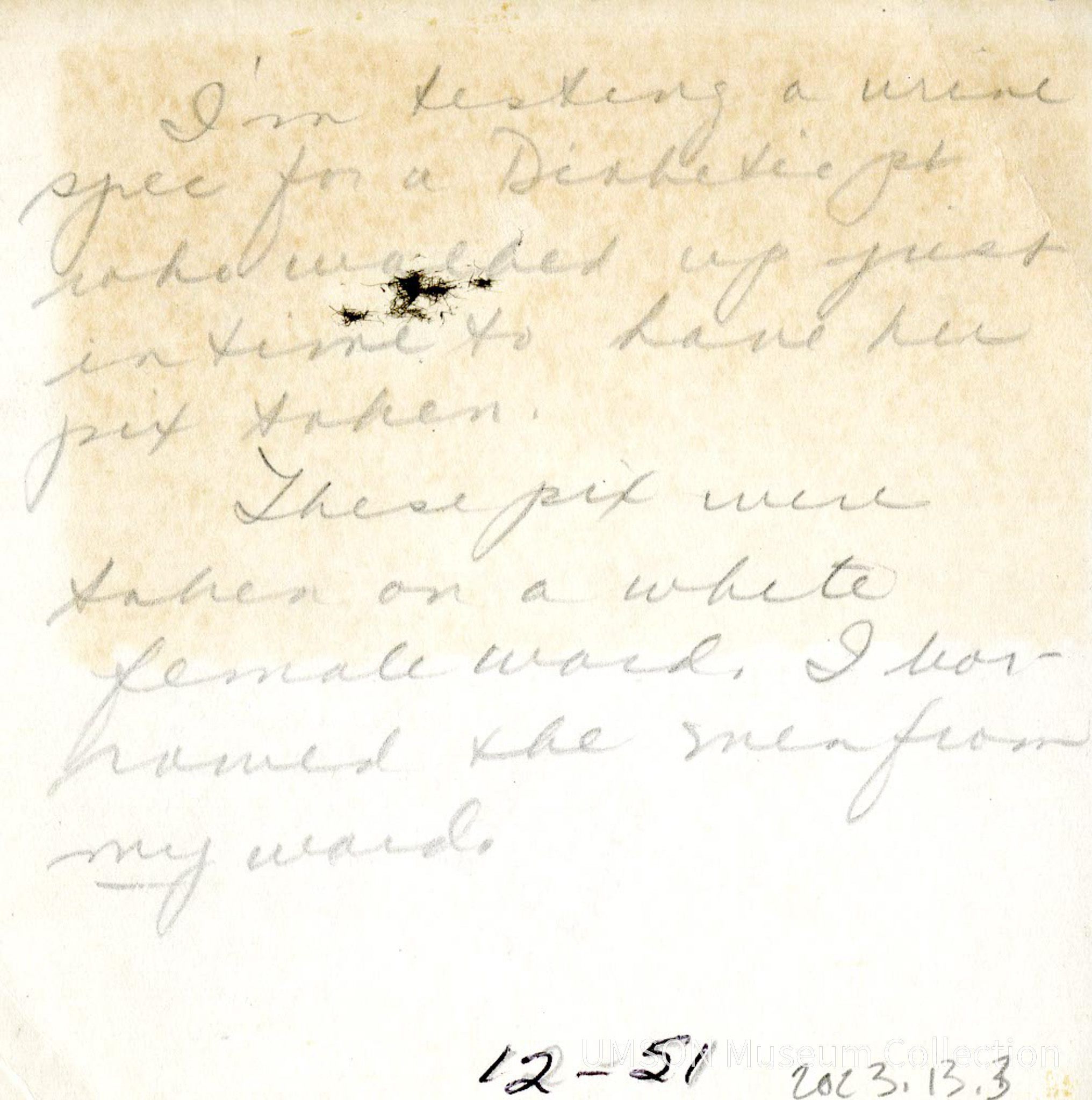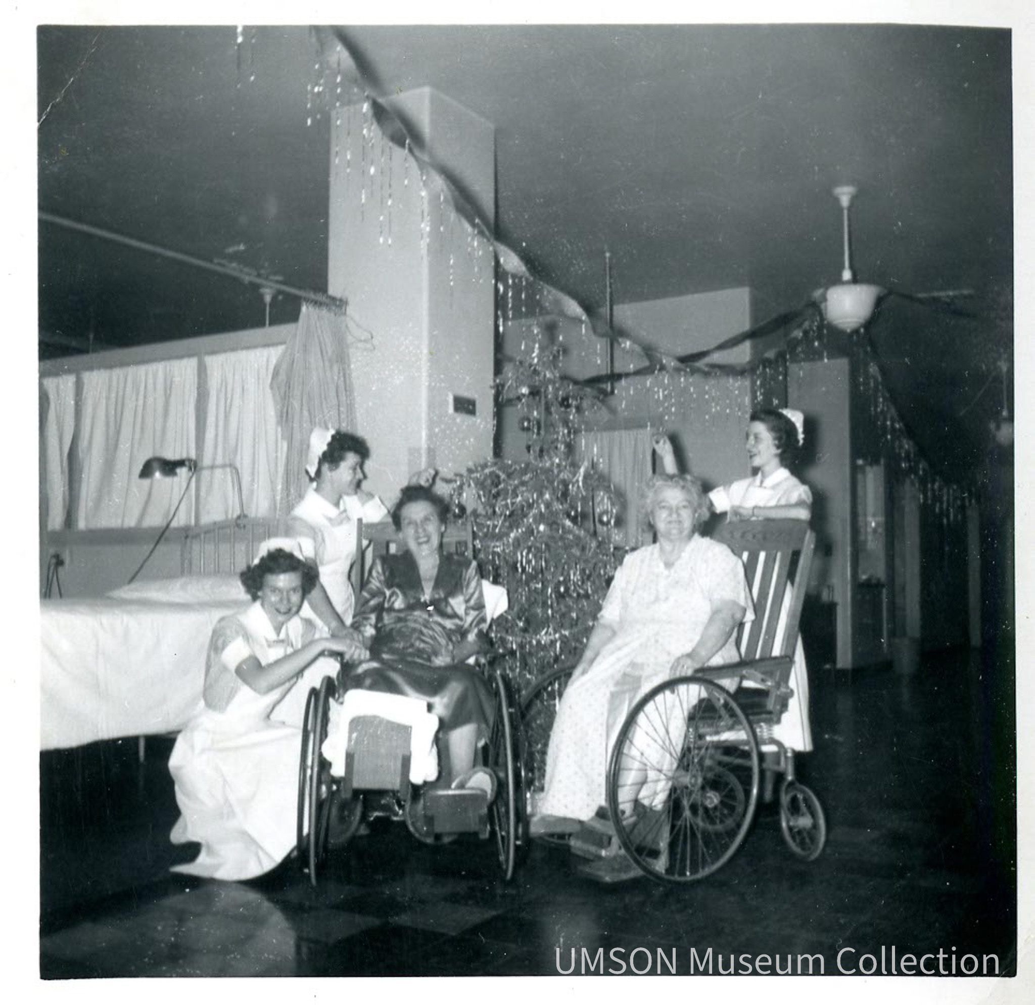 Three student nurses in short-sleeved striped uniforms and white aprons and cap pose with two female patients wearing bathrobes, seated in wheelchairs, in front of a tinsel-draped Christmas tree on a ward at University Hospital. Beds, curtains, and crepe paper streamers can be seen in the background. In pencil on verso: "I'm testing a urine spec[imen] for a Diabetic pt [patient] who walked up just in time to have her pix taken. These pix were taken on a white female ward. I borrowed the men from _my_ ward." Dated 12-51 in ballpoint pen center bottom. The men referred to are shown in 2023.13.4, not this image. 3.5" x 3.5"Acquisition