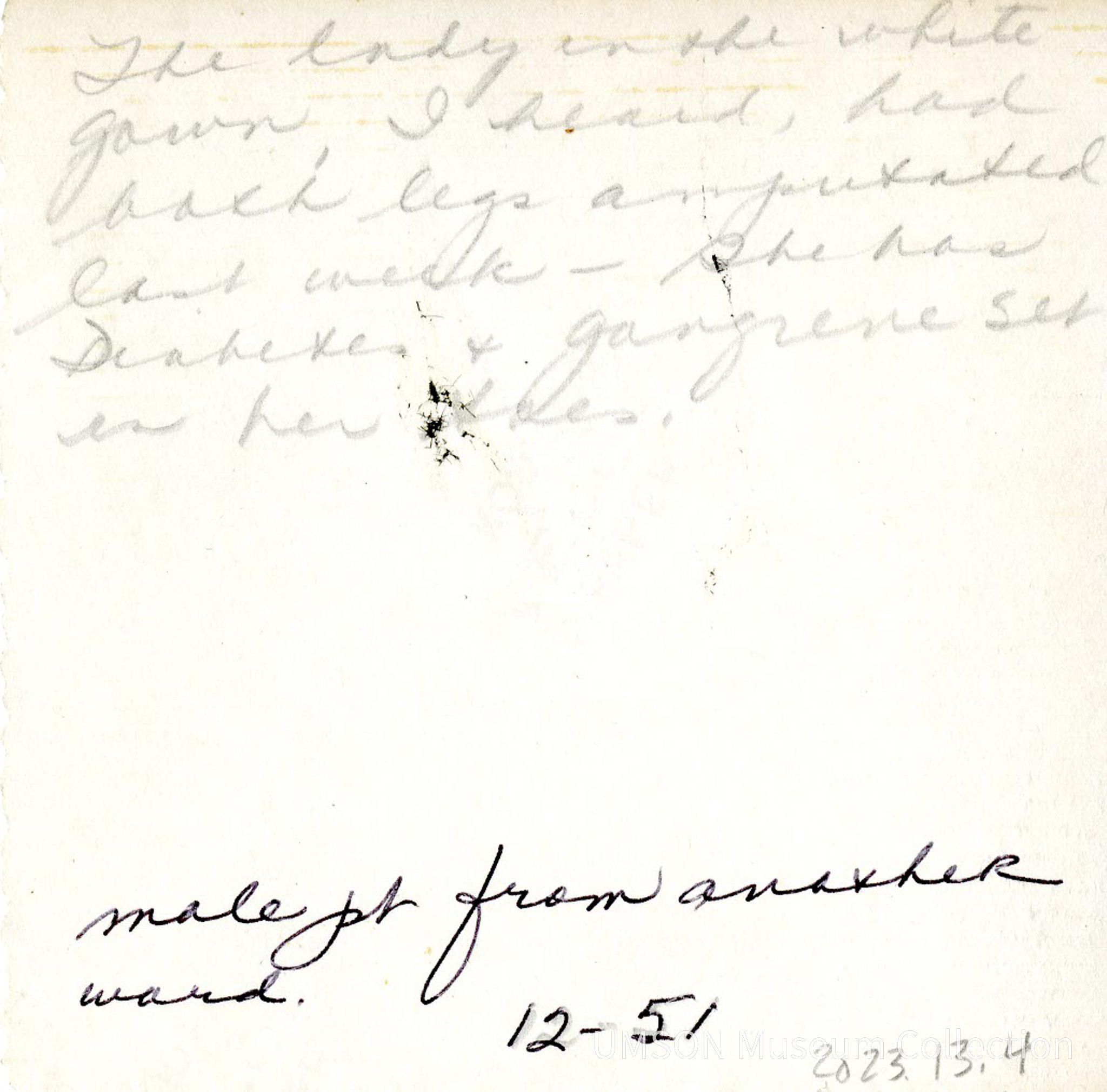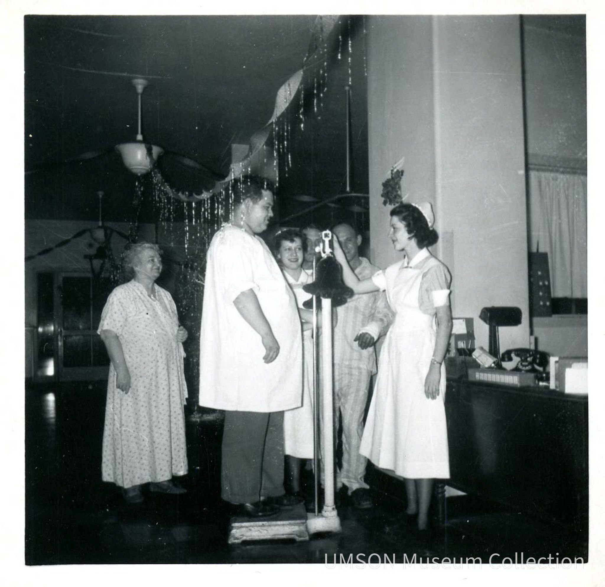 Student nurse in short-sleeved striped uniform, white apron and cap weighs a patient in hospital gown and dark trowsers who is standing on a metal scale. Female patient with grey hair, wearing a patterned robe, stands at back left, while another student and a male patient stand at center behind the scale. In pencil on verso: "The lady in the whote gown, I heard, had both legs amputated last week-- She has Diabetes + gangrene set in [sic] her toes." In ballpoint, center bottom, "male pt [patient] from another ward. 12-51" 3.5" x 3.5"Acquisition