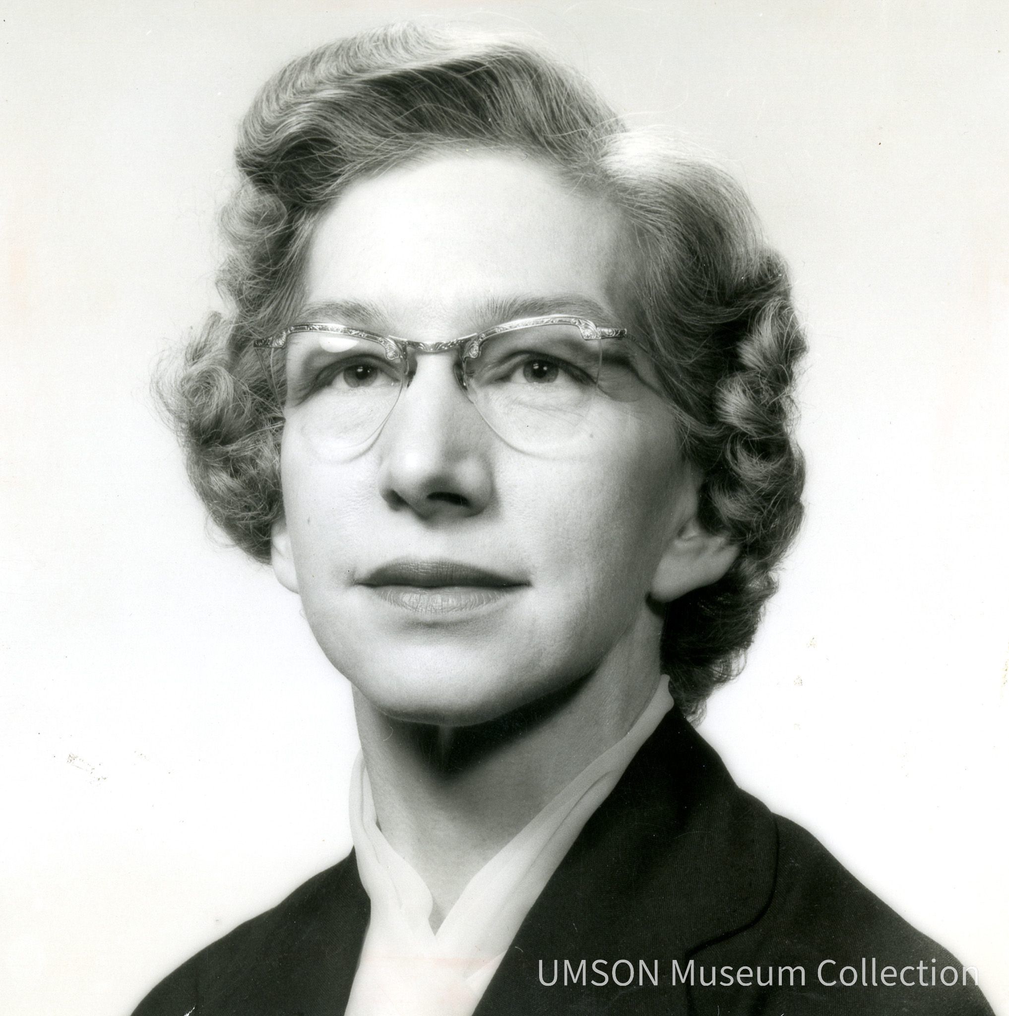 Black and white photograph of a short-haired woman with cat's-eye glasses in a dark suit and white blouse. Harriet Hall Bond, MS 1960Acquisition