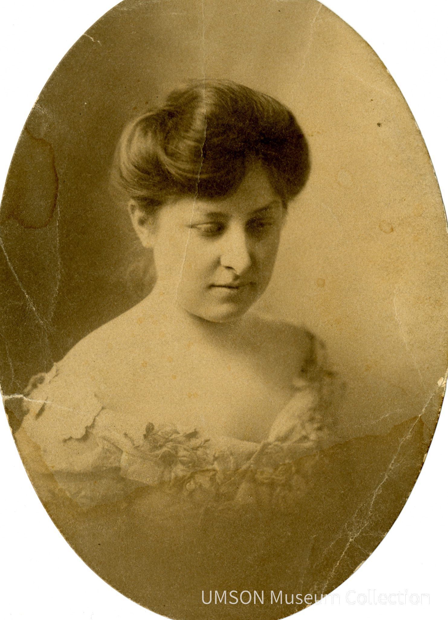 Oval platinum print portrait of a woman with upswept hair wearin an off-the-shoulder gown with floral embellishments along bodice neckline. Dora I. Brosenne, class of 1905. Gift of Elsie Taft, 1970Acquisition