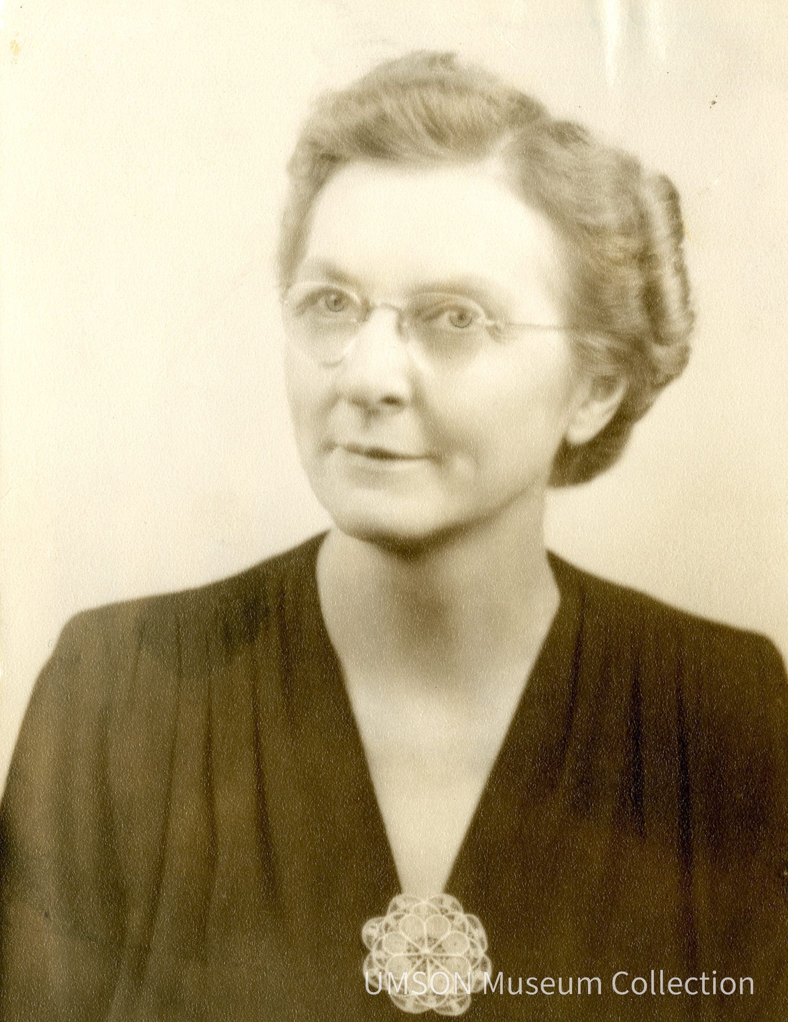 Platinum print mounted of a middle-aged woman wearing rimless glasses and a dark v-neck dress with an abstract floral brooch. Bernice V. Conner, DIN 1912Acquisition