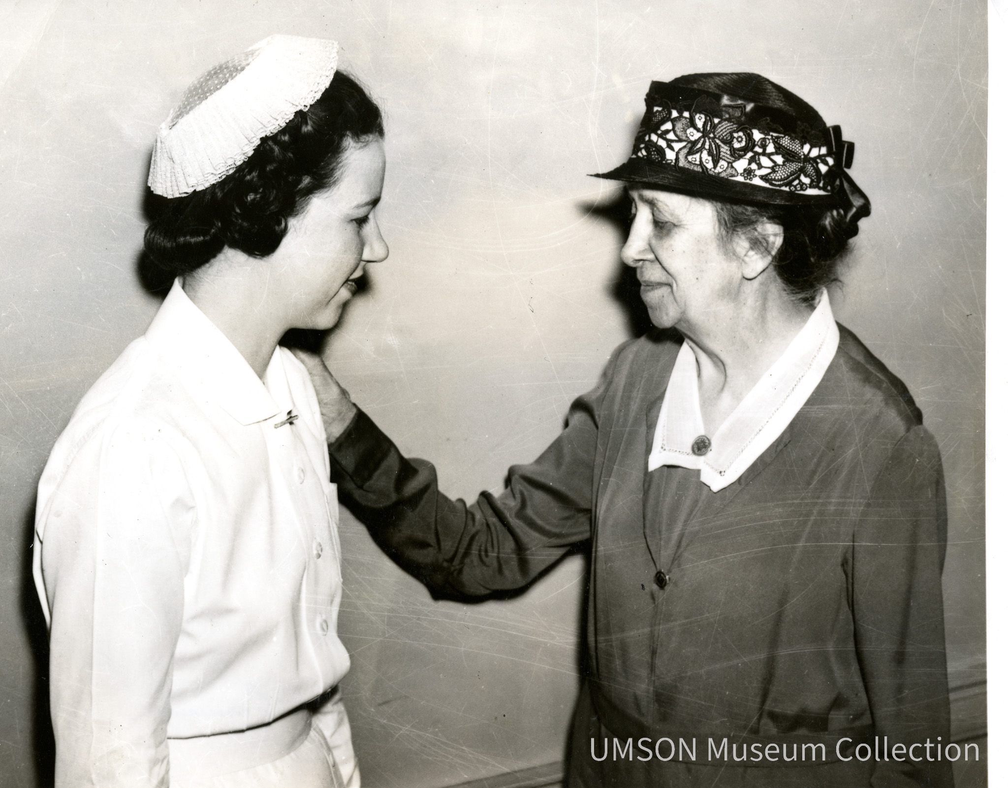 Margaret Wilson Webster (DIN 1939) left, in white graduate uniform and flossie cap with Mary E. Cornman (DIN 1893) at right. Miss Cornman wears a black dress and white collar from about 1920 with a black silk hat trimmed with white ribbon and black lace.Acquisition