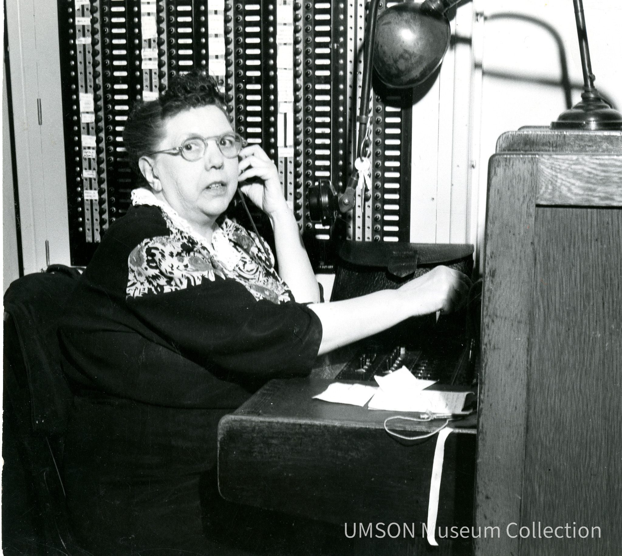 Black and white photograph of a woman in a dark dress and round, clear glasses seated at a telephone switchboard, holding a plug. Mrs. Gleason was the receptionist at Parsons Hall.Acquisition