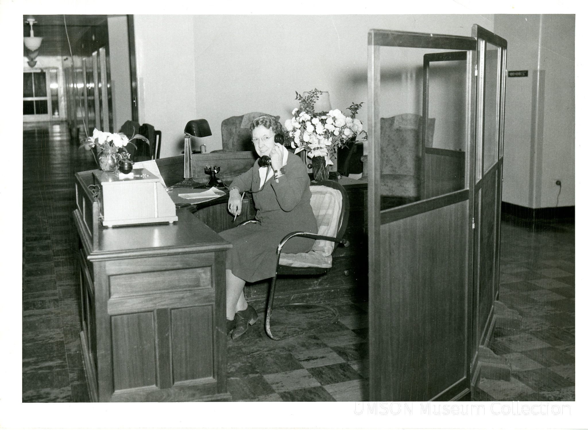 Black and white photograph of a woman in a dress seated at a wooden desk with a telephone receiver in her hand. The desk is in the reception area of a building entrance, with the doorway visible in the left background.Acquisition