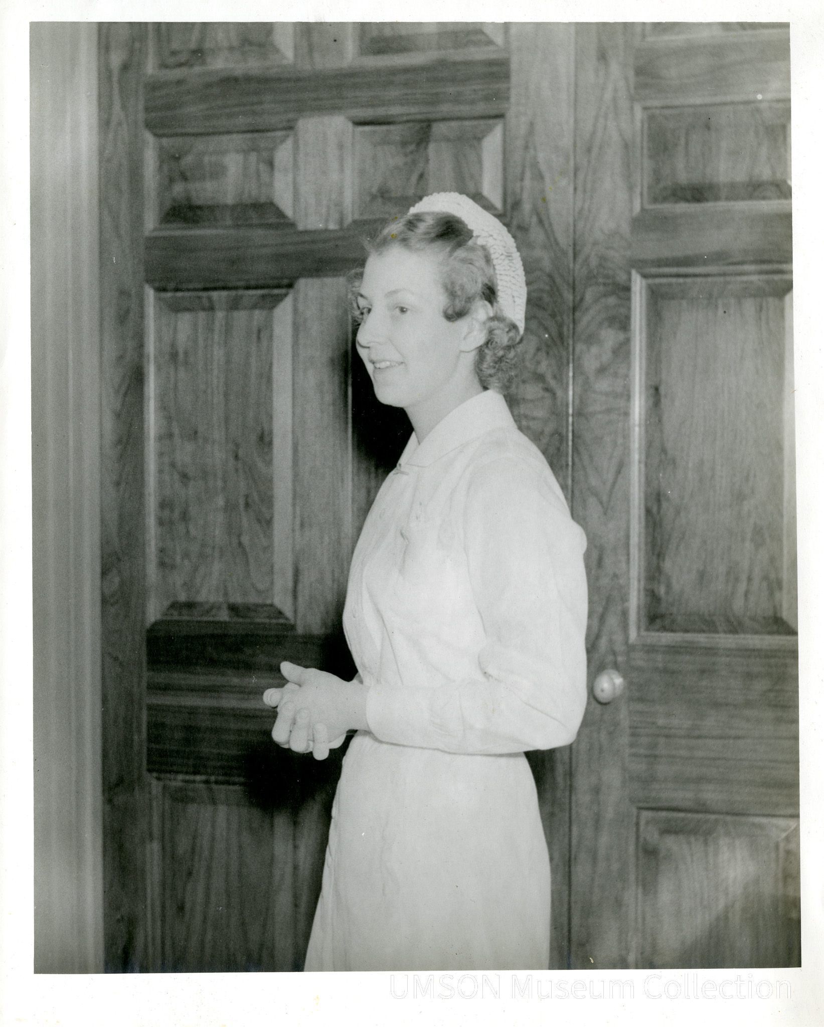 Informal profile portrait of Carola Graham in long-sleeved white graduate uniform and flossie, posed against a paneled wooden door. DIN 1938Acquisition
