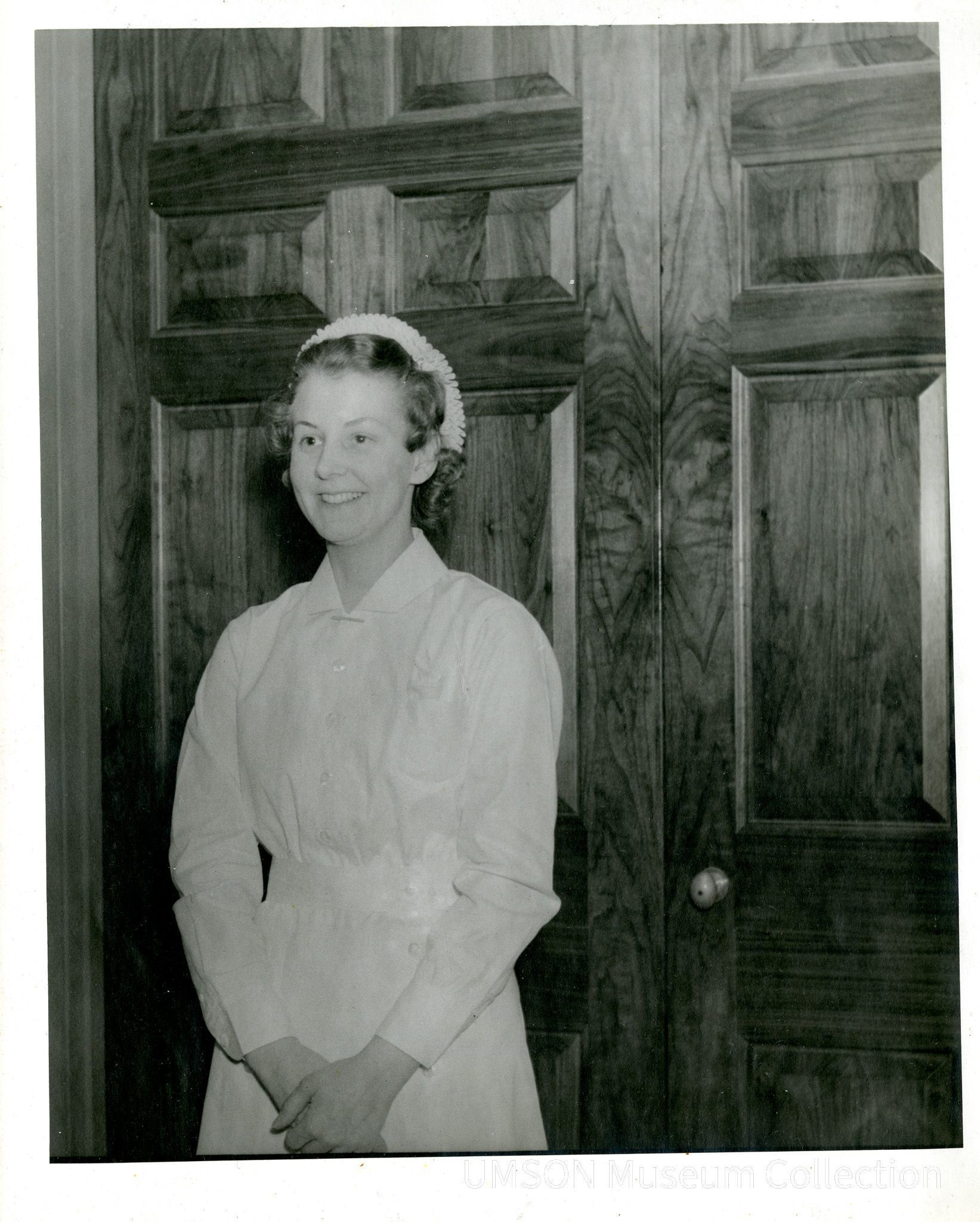 Informal three-quarter portrait of Carola Graham in long-sleeved white graduate uniform and flossie, posed against a paneled wooden door. DIN 1938Acquisition