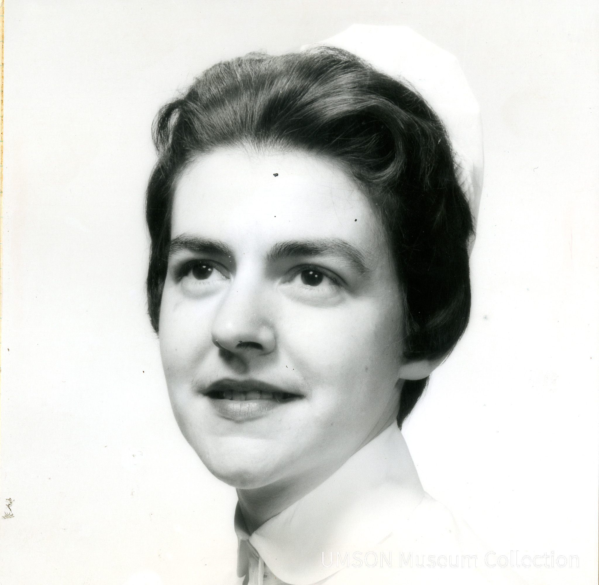 Hopkins graduate nurse Shirley Hale, instructor at UMSON, shown in a black and white photo wearing a high, round-collared white uniform and cap.Acquisition