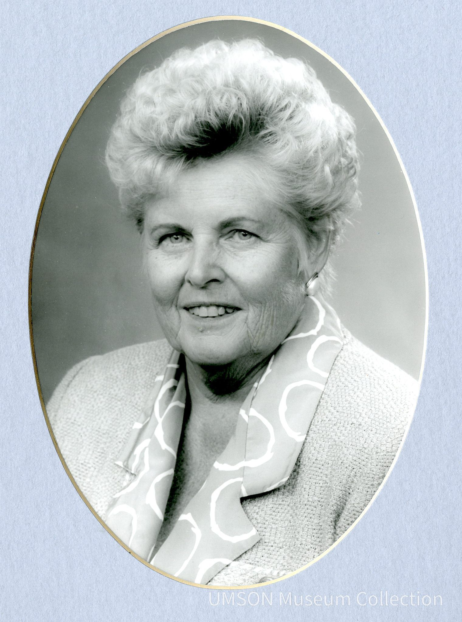Dr. Nan B. Hechenberger, Dean of the School of Nursing, 1978-1989. Black and white photographic portrait of Dr. Hechenberger wearing a textured suit jacket and patterned blouse. Mounted in mat board in an oval-cut mat.Acquisition