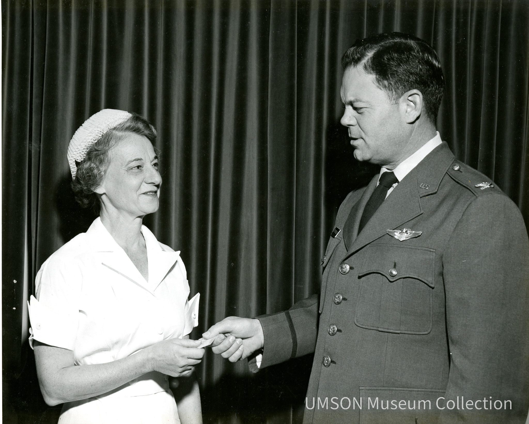 Anne Hoffman Lynd (1907-1970) DIN 1928 in short-sleeved graduate uniform and flossie receiving award from US Army colonel. Black and white glossy photograph.Acquisition