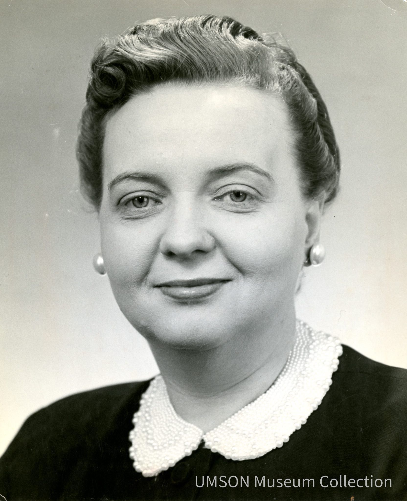 A Miriam Jamison, Assistant Dean of Women, Charge of Residence, 1957-1961. Black and white photgraph of a woman with waved hair wearing a dark dress with beaded white collar and pear earrings.Acquisition