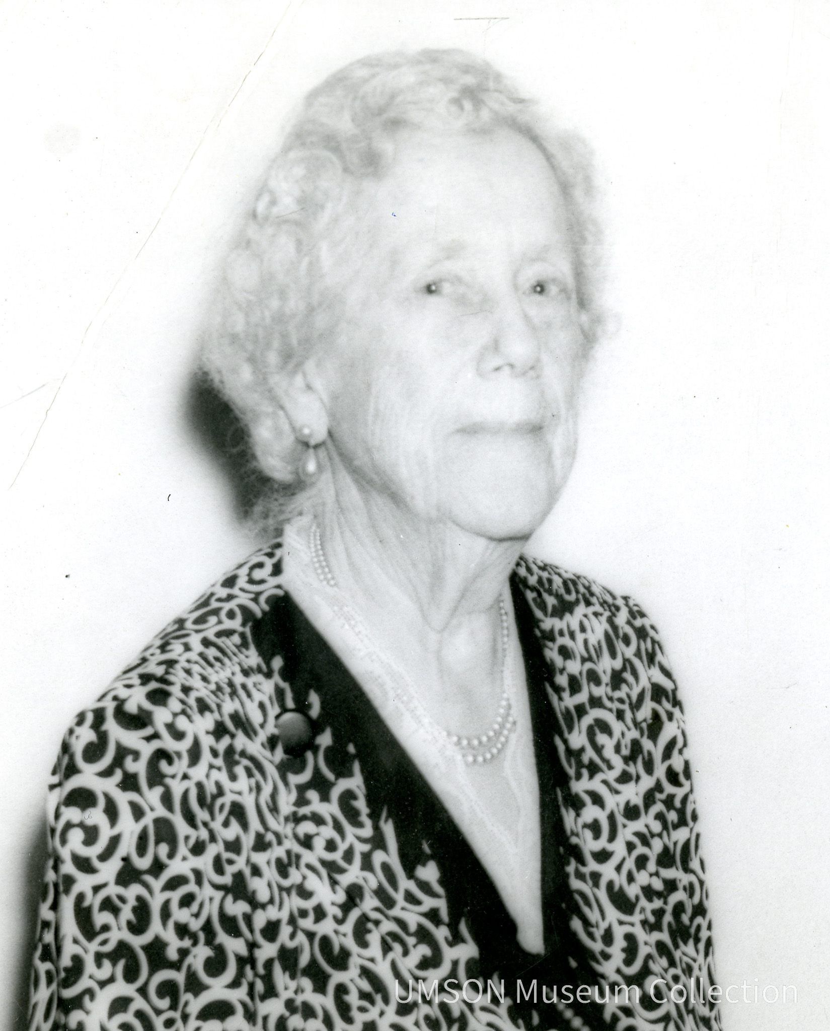 Nannie Jacqueline Lackaland, DIN 1898 shown in a scroll-patterned jacket or dress with a lace insert collar and double strand of pearls. Photo used opposite 6 page of the 1948 Nurses' Alumnae Bulletin. https://archive.org/details/bulletinnurs19471953unseAcquisition