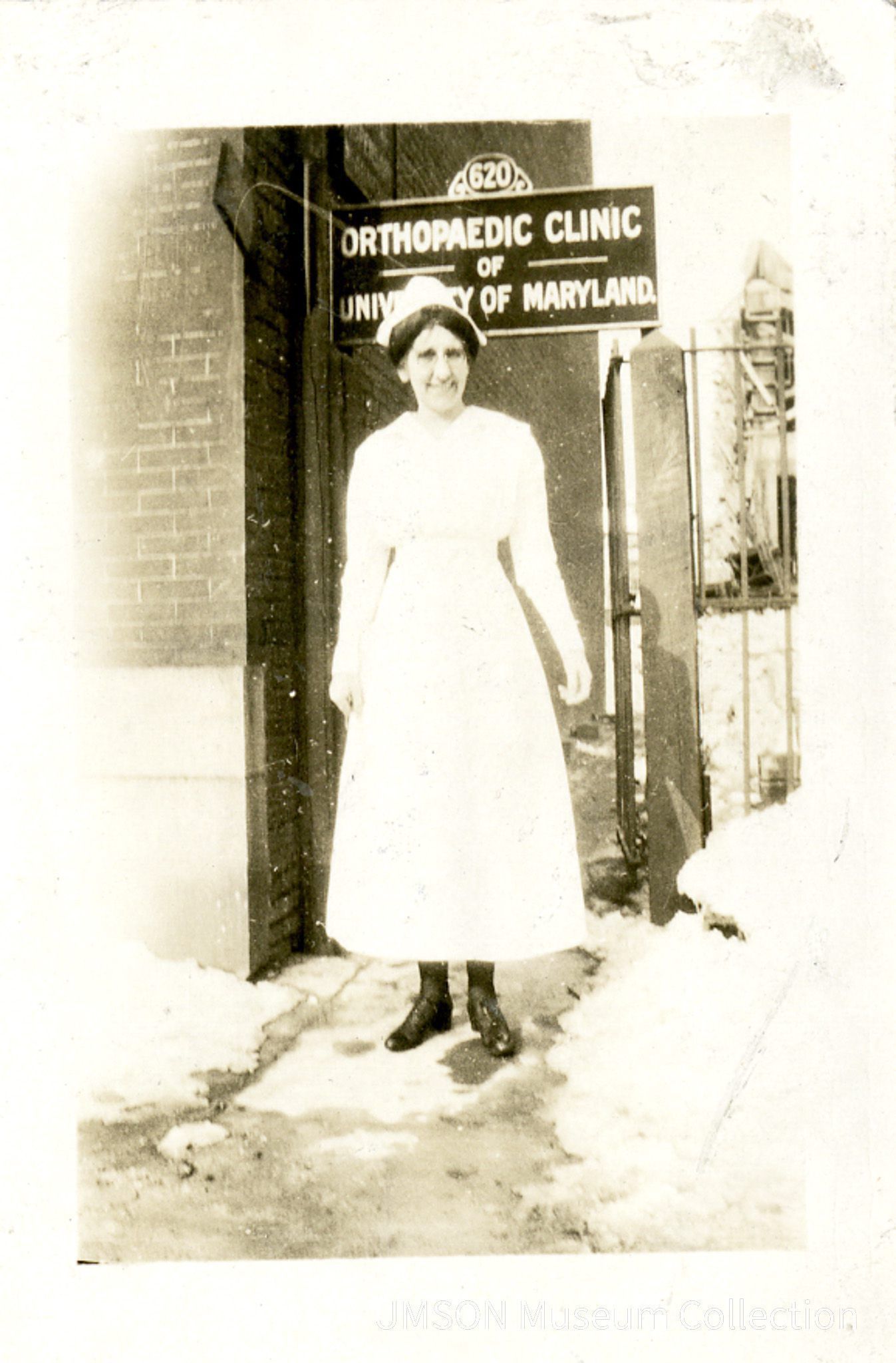 Miss Lucy Marshall, superintendent of nurses, University Hospital, 1919-1922. Shown in Long-sleeved white uniform and nurse's cap standing in front of a sign for the Orthopedic Clinic of the University of Maryland, She was not an UMSON graduate.Acquisition