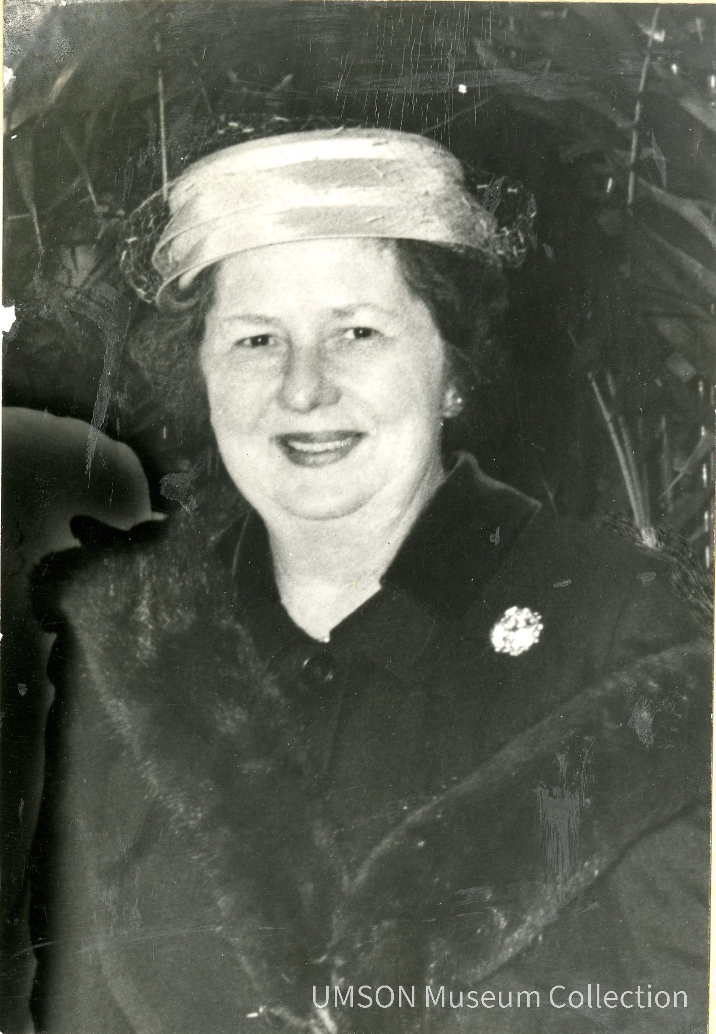 Blanche Lee Martin, DIN 1921. President of the Nurses' Alumnae Association from 1928-1931, treasurer, 1942-1961. Martin is depicted in fur-collared coat over a dark dress worn with a bright brooch and a shiny hat with veil.Acquisition