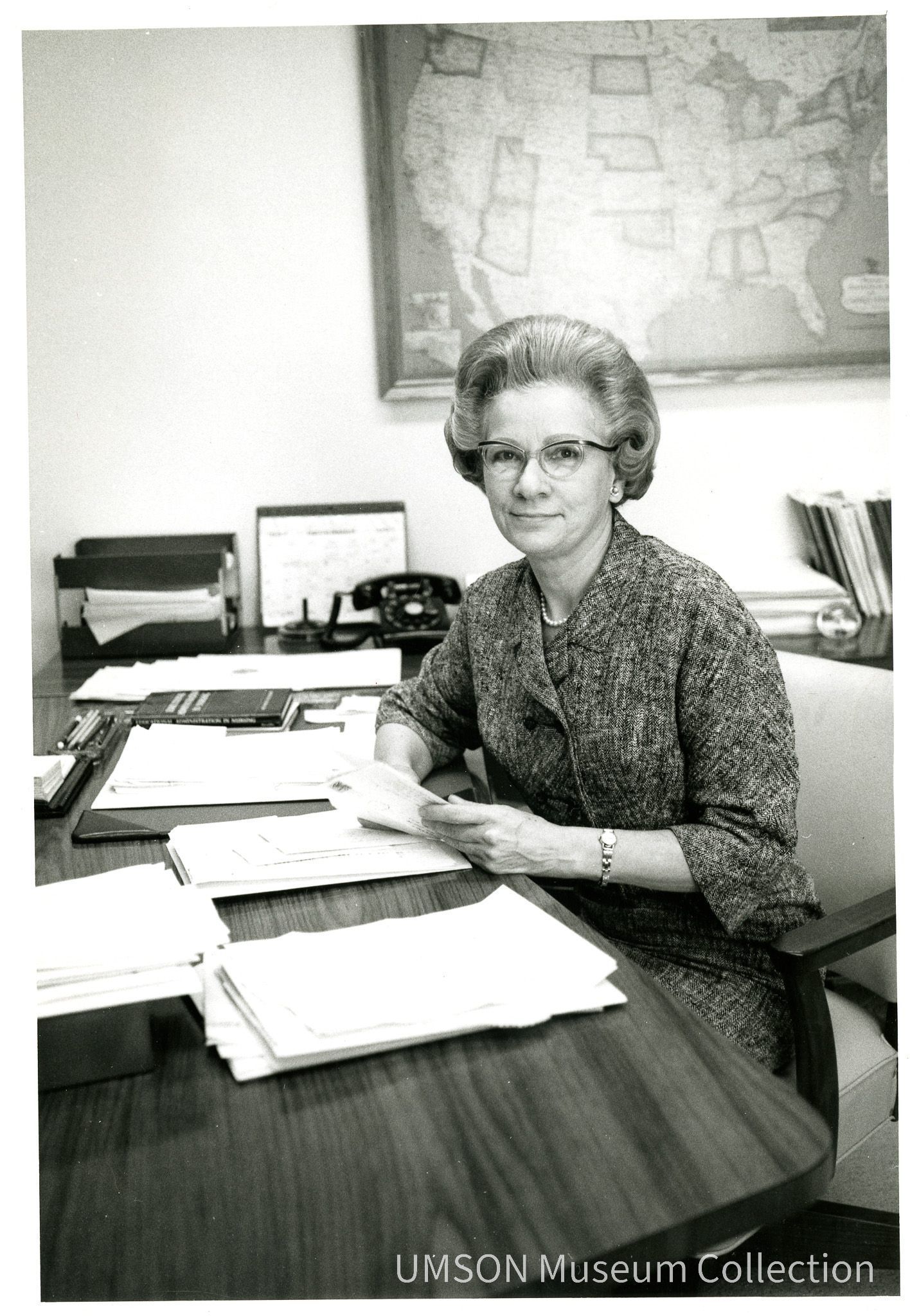 Dr. Marian Murphy, Dean of the School of Nursing, seated at a desk with a map of the United States hanging on the wall behind her. She is wearing an abstract-patterned tweed skirt suit with pearls, glasses, and a small watch. Photograph by Philip SzczepaAcquisition