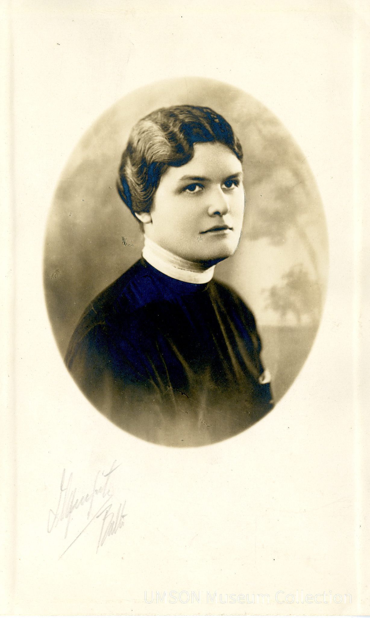 Ethel Monroe (DIN 1917) platinum-toned bust length portrait in a dark dress with a high neck and simple white collar. Photograph by Ilgenfritz, Baltimore. In a cardboard folder.Acquisition
