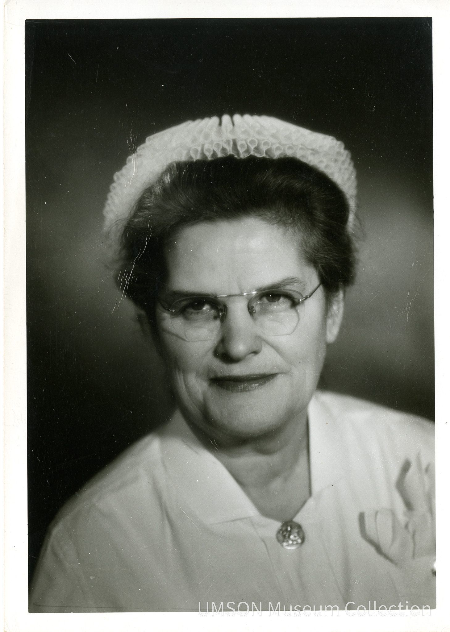 Ethel Monroe (DIN 1917) headshot in graduate uniform and flossie, with handkerchief in left breast pocket and pin at collar.Acquisition