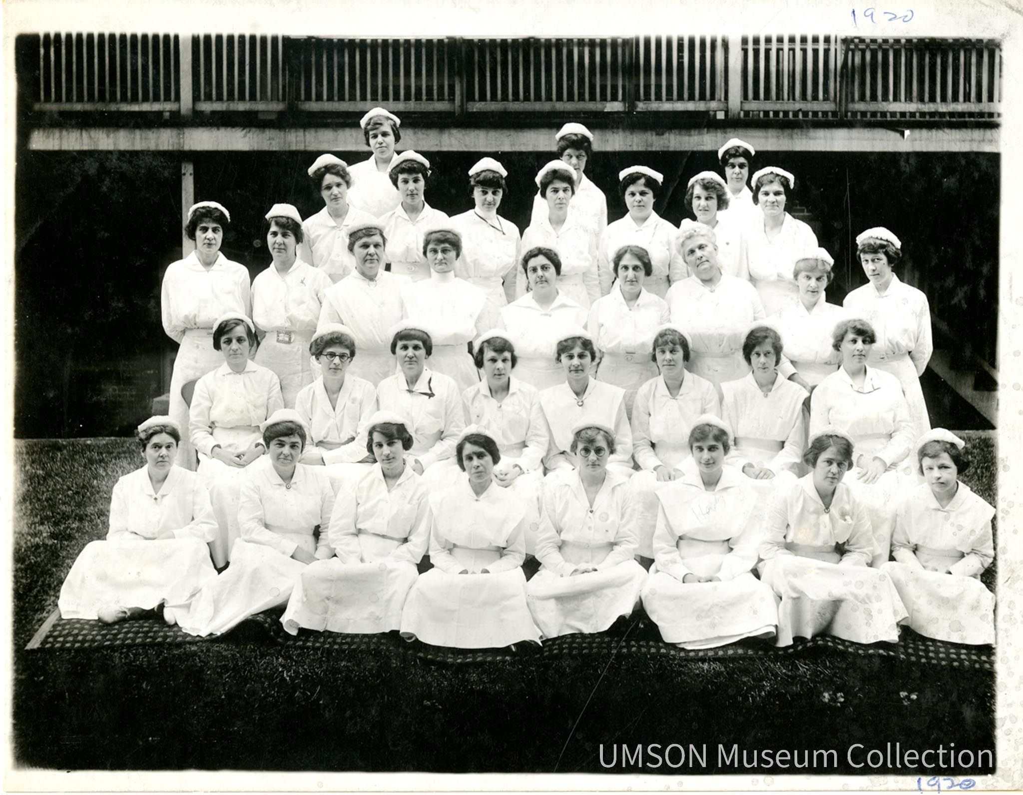 Group photograph of graduate nurses in white dress uniforms, starched aprons, and caps, in five rows, from seated on the ground to standing in three rows.Photograph Details
