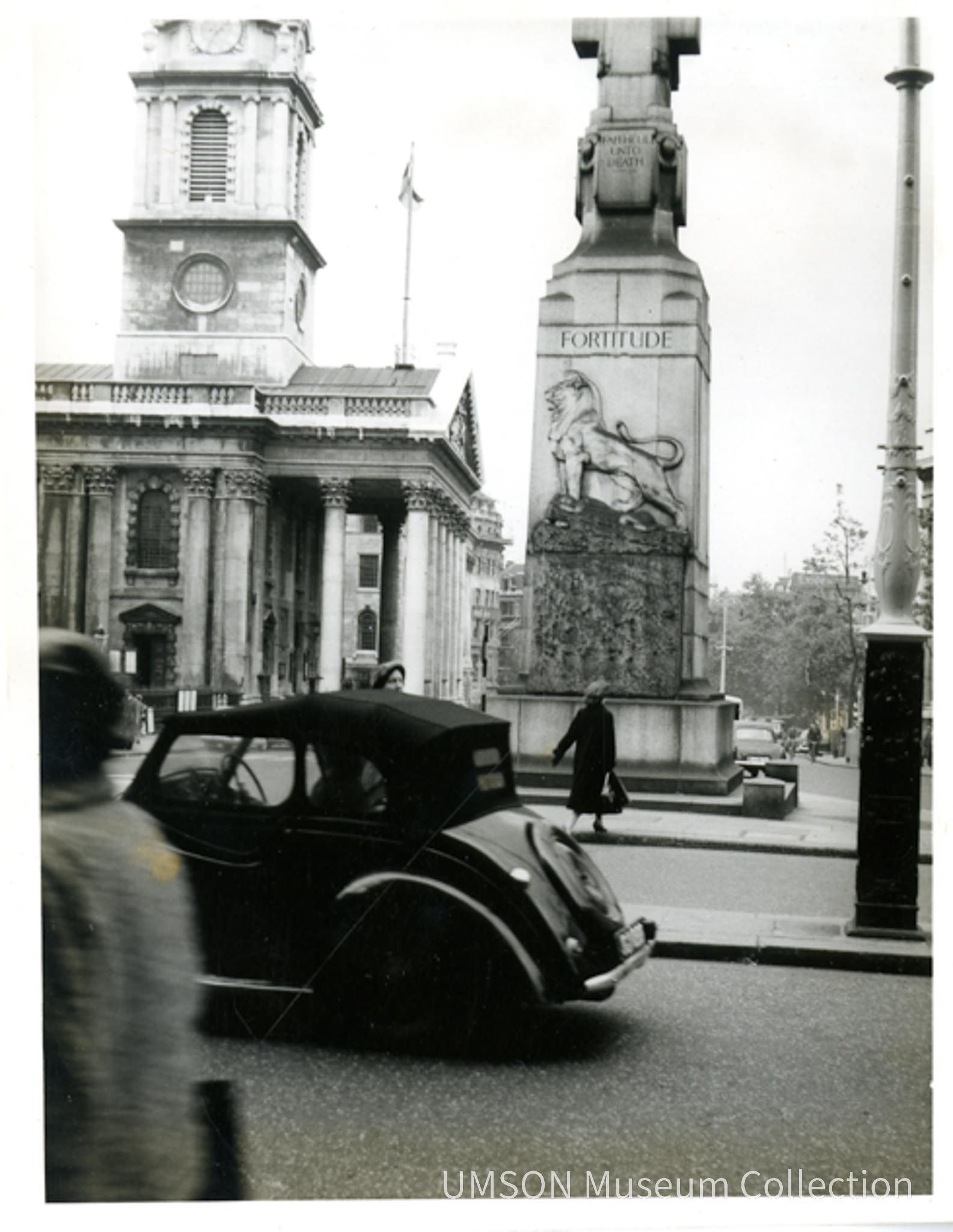 Detail of one side of the Edith Cavell Memorial in London featuring a bas-relief lion statant on an incline, its tail curved over its back, below the incised word FORTITUDE. A tonneau-covered car is in the foreground; a woman in a dark coat with a large black bag crosses the street between the car and the memorial.Photograph Details