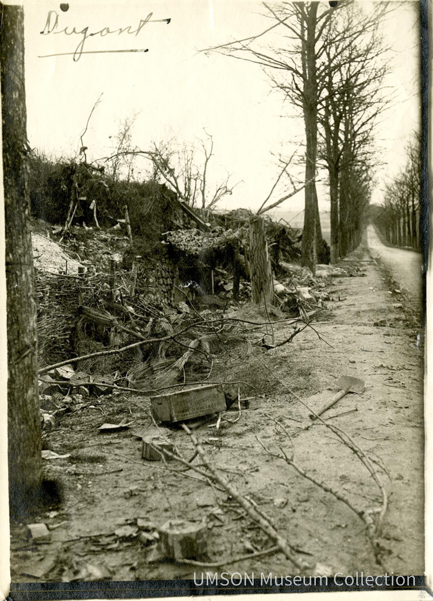 View of a dugout along an unpaved road in France, possibly near Savenay. A fascine reinforces the slope inside the tree line. Reels of wire, spool boxes, a shovel, and a wooden crate marked "Metallic Cartridges, Remington Arms" lie scattered in the foreground.Photograph Details
