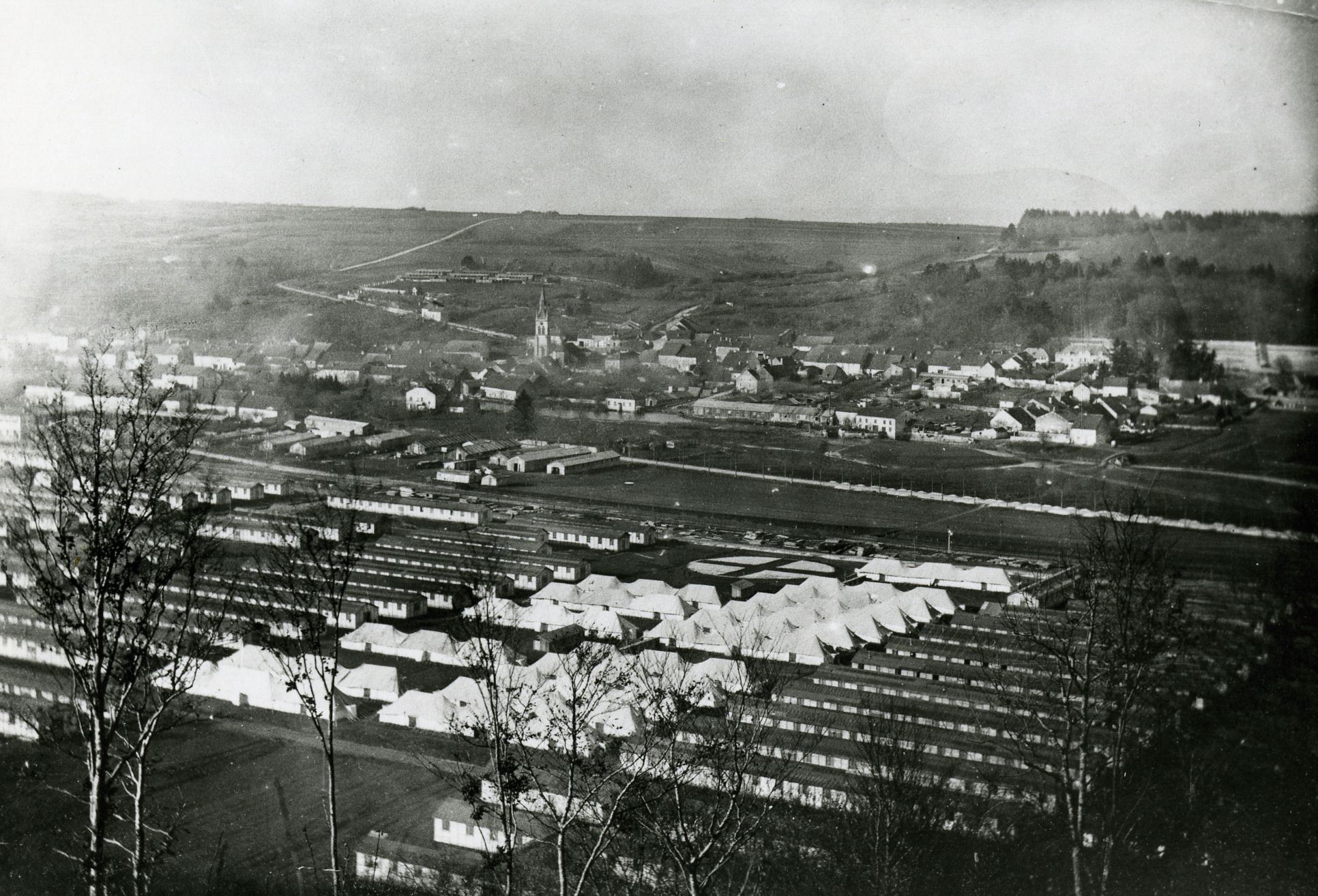 Wide view of barracks and tents of Base Hospital 42 (University of Maryland) in Bazoilles-sur-Meusem France, set up in World War I.Photograph Details