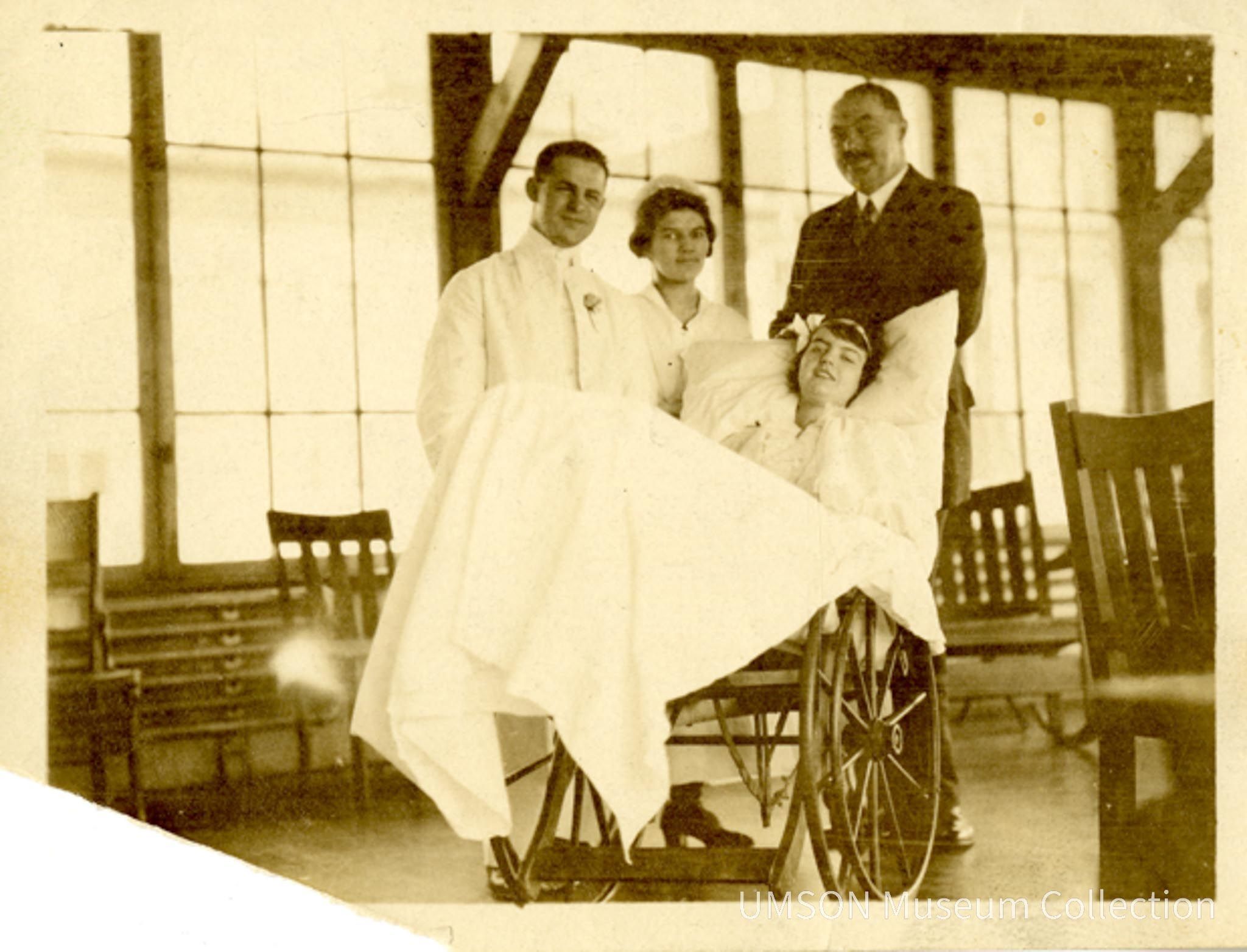 Patient in a wheelchair attended by a physician, nurse, and family member, University Hospital ca. 1920Entry/Object ID