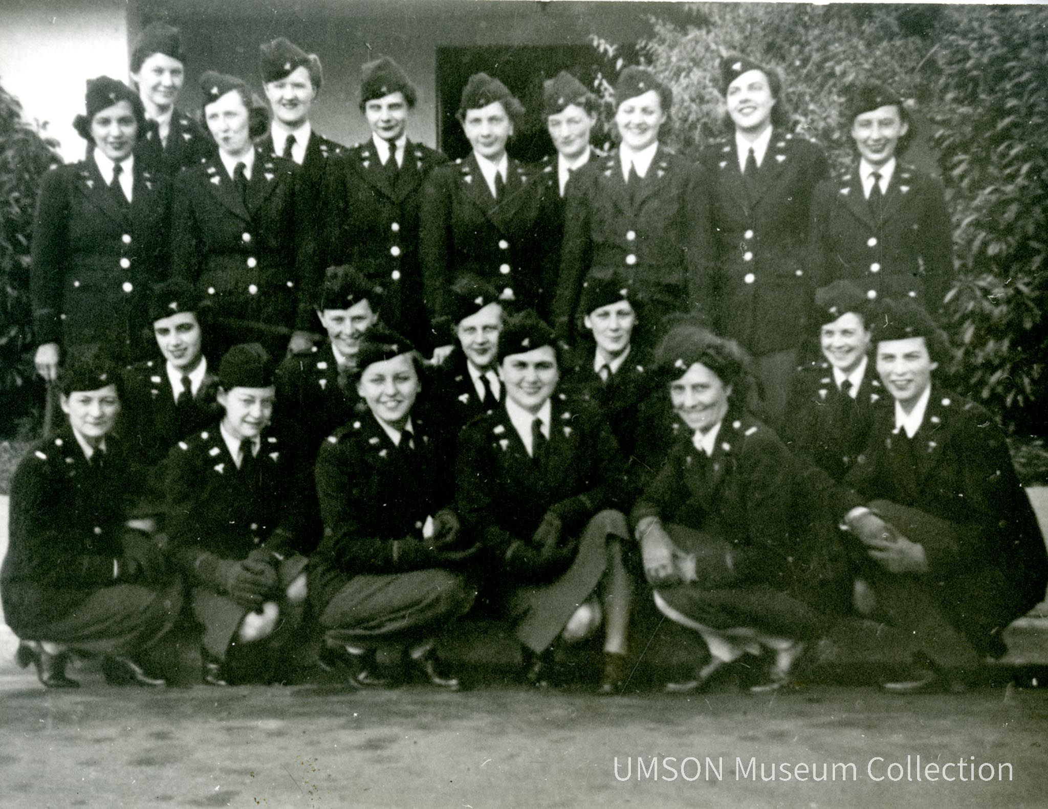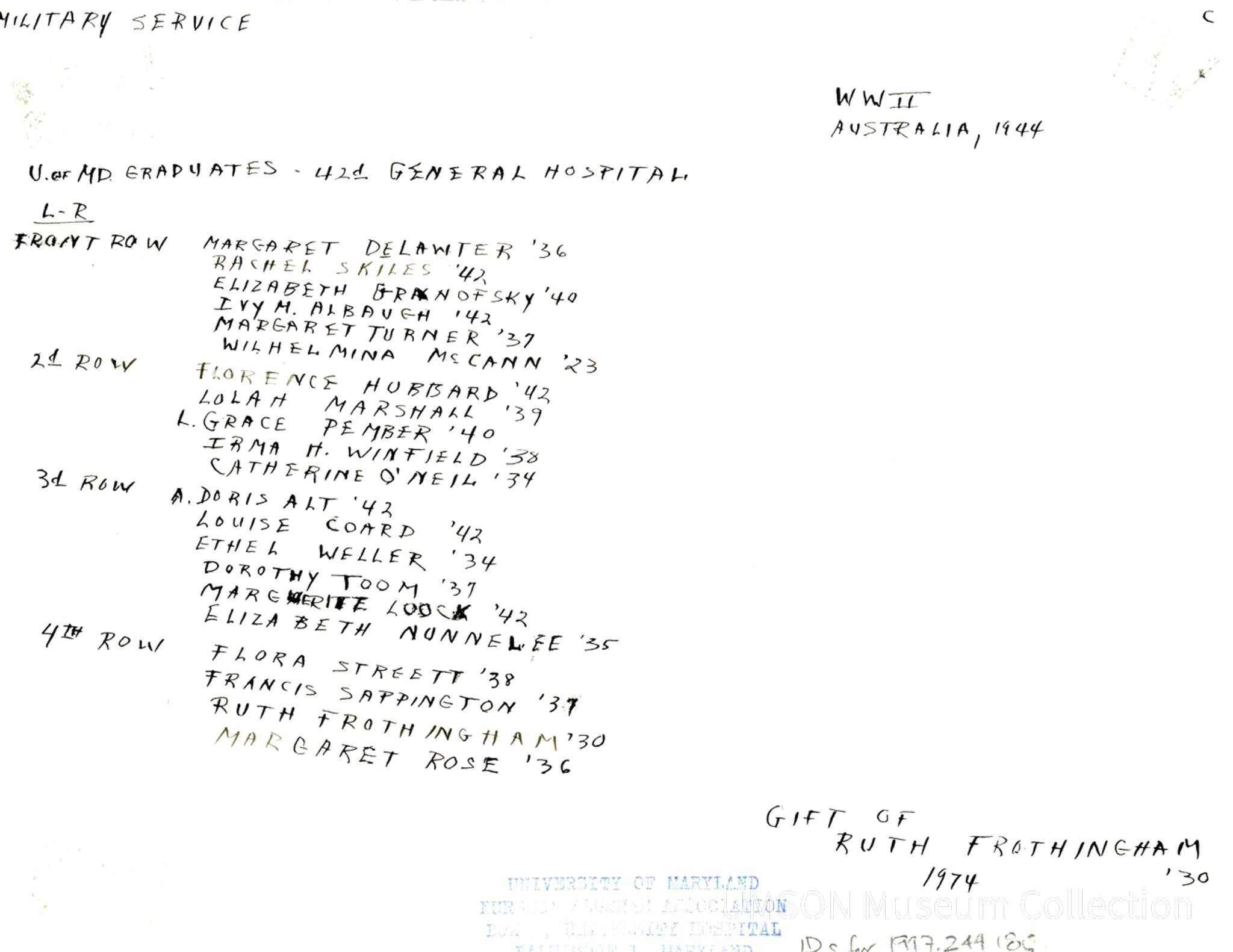 U. of MD graduates- 42nd General Hospital L-R Front Row Margaret Delawter '36; Rachel Skiles '42; Elizabeth Granofsky '40; Ivy M. Albaugh '42; Margaret Turner '37; Wilhemina McCann '23; 2nd Row Florence Hubbard '42; Lolah Marshall '39; L. Grace Pember '40; Irma H. Winfield '38; Catherine O'Neil '34; 3rd Row A. Doris Alt '42; Ethel Weller '34; Dorothy Toom '37; Marguerite Loock '42; Elizabeth Nunnelee '35; 4th Row Flora Street '38; Francis Sappington '37; Ruth Frothingham '30; Margaret Rose '36. Gift of Ruth Frothingham '30, 1974Language