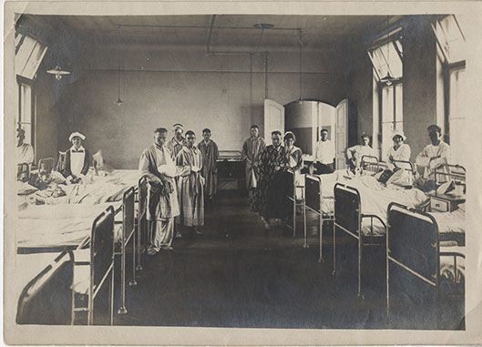 Interior view of a men's ward in an unidentified hospital, possibly in France during World War I. Nurses in uniforms and caps stand next to and behind iron beds, while male patients in pyjamas and robes stand in the middle of the ward.Photograph Details