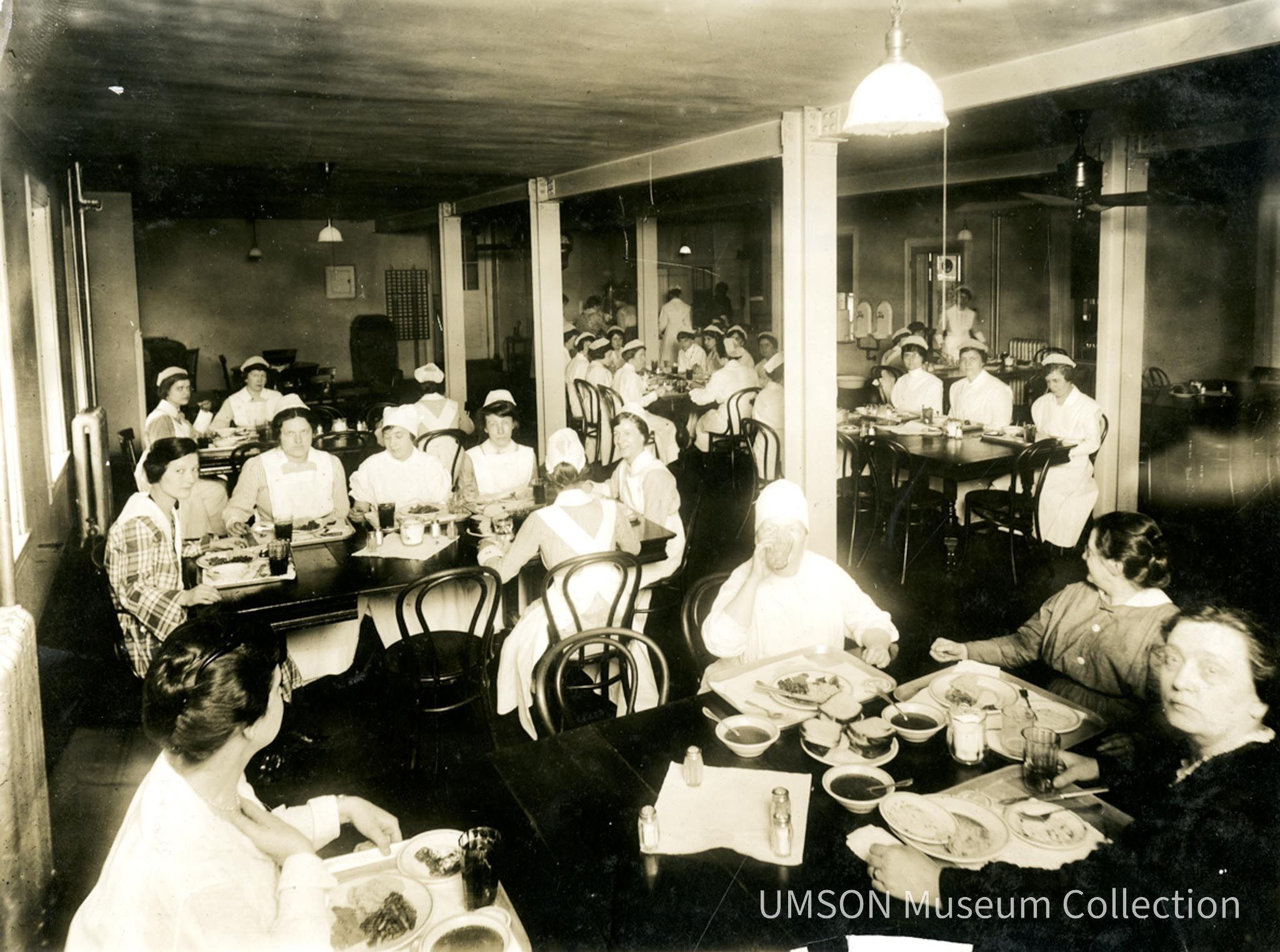 Uniformed student and graduate nurses sit at rectangular tables with staff in street clothes in a low-ceilinged room with pendant lights and radiators. Trays with meals in china bowls and plates sit on the tables.Photograph Details