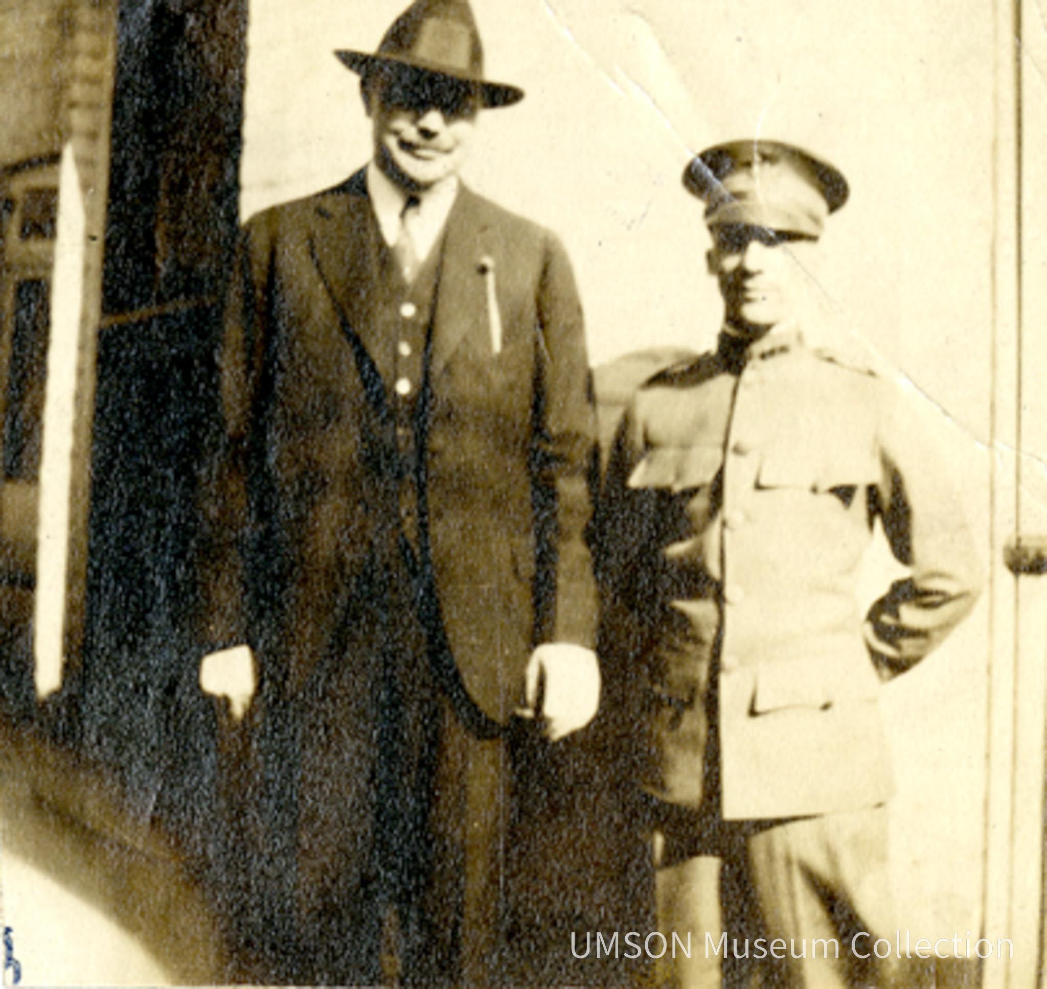 Dr. Robert Parke Bay (1885-1940) UMSOM 1905 stands at left with Dr. Julio Rufino Rólenson-Martínez (1889-1963) UMSOM 1916. Dr. Rolenson wears a Leiutenant's uniform. He served with the U.S. Army Expeditionary Forces in France durign World War I. Dr. Bay taught oral surgery at the UM School of Dentistry.Photograph Details