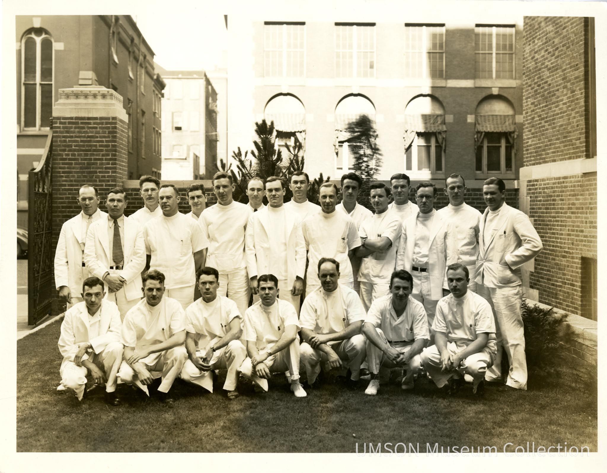23 men in white shirts, coats, and trousers kneeling and standing in a courtyard, probably on Lombard Street. Identified as University of Maryland School of Medicine Interns, 1934-1935: Dr. Keown, Dr. Brooks., Dr. Langeluttig, Dr. Siwiniski, Dr. fearing, Dr. Caples, Dr. Dumler, Dr. Roberson, Dr. Moore, Dr. Brugler, Dr. McNally, Dr. Howard, Dr. Way, Dr. Barnhardt, Dr. Goodhand, Dr. Farr, Dr. Taylor, Dr. Stackhouse, Dr. Browning, Dr. Harrison, Dr. Hull, Dr. Burgtorf, Dr. DuPuy.Photograph Details