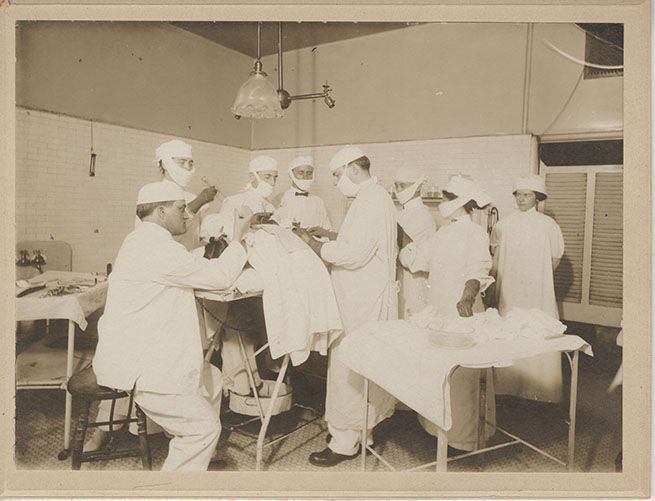 Interior view of tile-lined operating room with surgeons and nurses around a patient. 6 physicians and 2 nurses attend the patient; they are wearing white surgical gowns, caps, and masks. The anesthetist at the patient's head and a nurse in the background are unmasked.Photograph Details