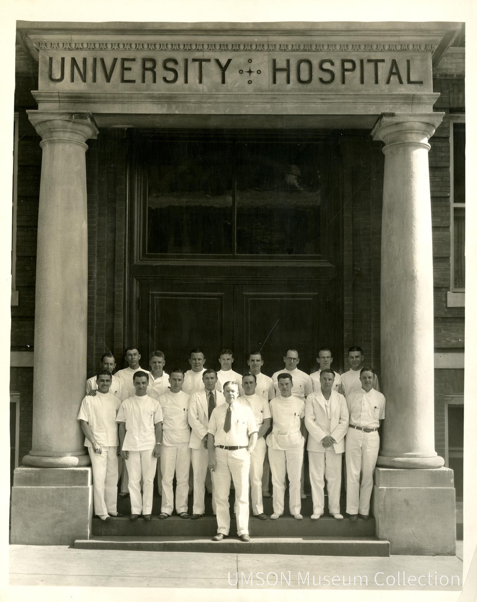 18 men standing on the steps of University Hospital entrance on Lombard Street, wearing white shirts and jackets. Identified, apparently in pairs of back row-front row, from left to right: Dr. Barnhardt ("Barney"); Dr. Pico ("Jose"); Dr. Way ("Sam"); Dr. Ahroon ("Dick"); Dr. Warren ("Pee Wee"); Dr. Taylor ("Cliff"); Dr. Roberts; Dr. Langluttig; Dr. Van Metre ("Van"); Mr. Holland; Dr. Baker; Dr. Bowman; Dr. Keown ("Larry"); Dr. Moore ("Jimmy"); Crown Prince of Japan Dr. Hull ("Harry"); Dr. Cook; Dr. Stackhouse ("Hildy").Photograph Details