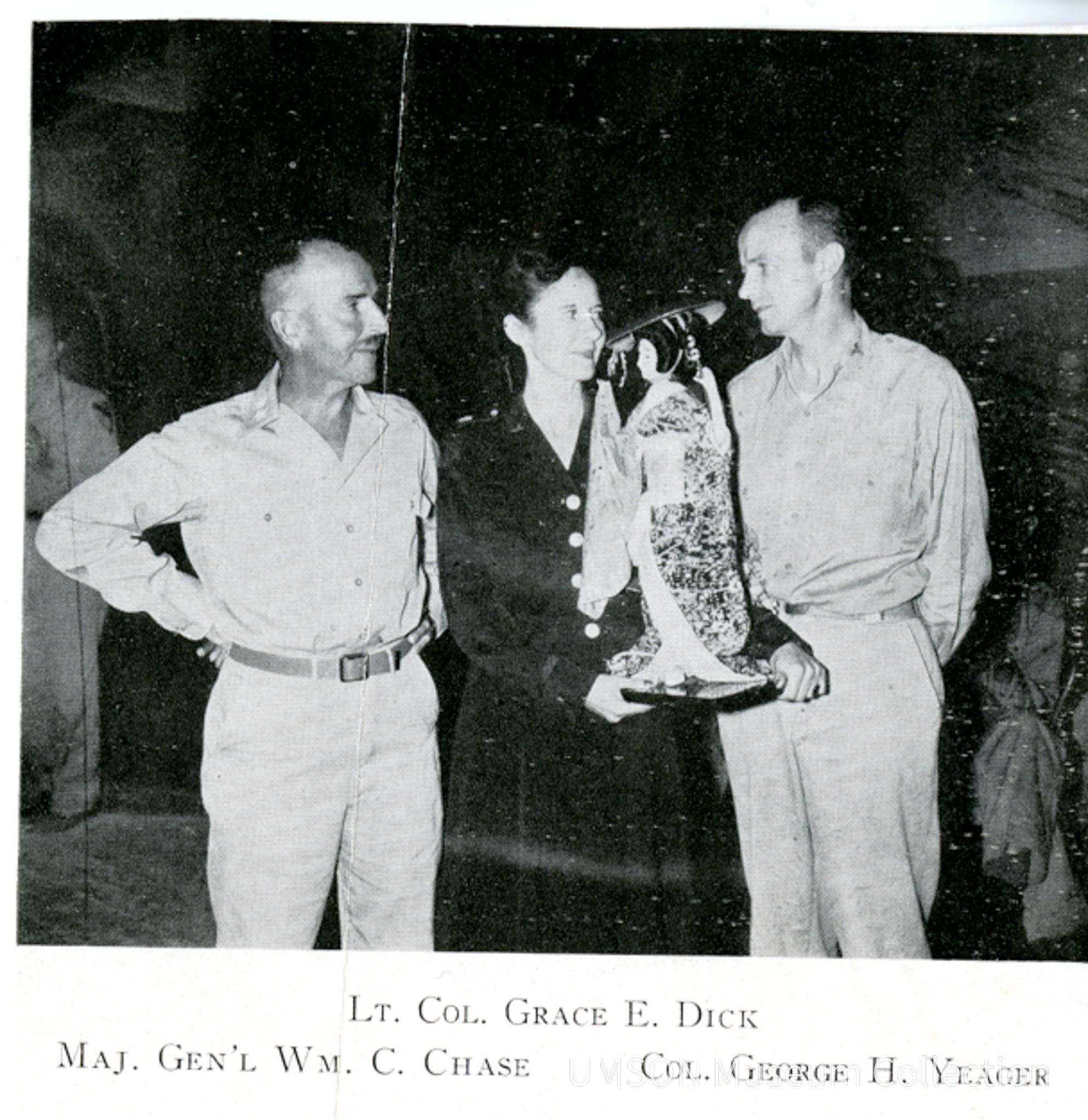 Halftone image of Major General William C. Chase, arms akimbo in khaki undress uniform (left) with Lieutenant Grace. E. Dick, in blue off-duty dress holding a Japanese doll (center), and Colonel George E. Yeager in khaki undress uniform, hands behind his back (right).Photograph Details