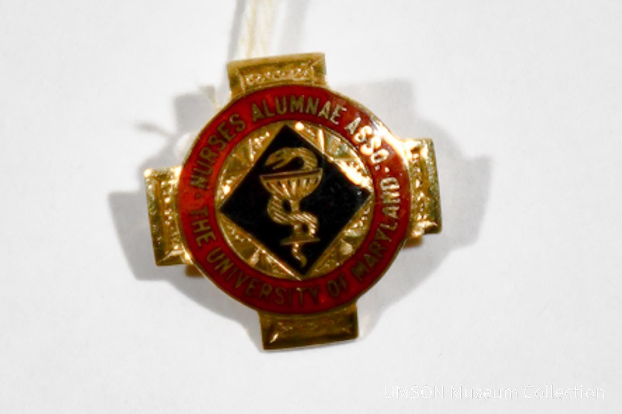 Pin in 14K gold with red and black enamel. Front cross-shape with rod of Asclepius in gold against a black diamond. Red enamel ring with "Nurses Alumnae Assoc. * The University of Maryland * " Engraved on reverse, "Beatrice/ Krause/ 1807/ 1927"Acquisition