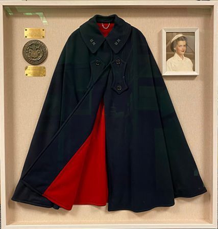 48" x 41" x 3" framed assemblage of memorabilia related to Buuny Tegler's time as a student and alumni of the University of Maryland (College Park) and UMSON. Includes her blue wool student cape, a hand-colored senior portrait, bronze medal, and two brass plaquesAcquisition