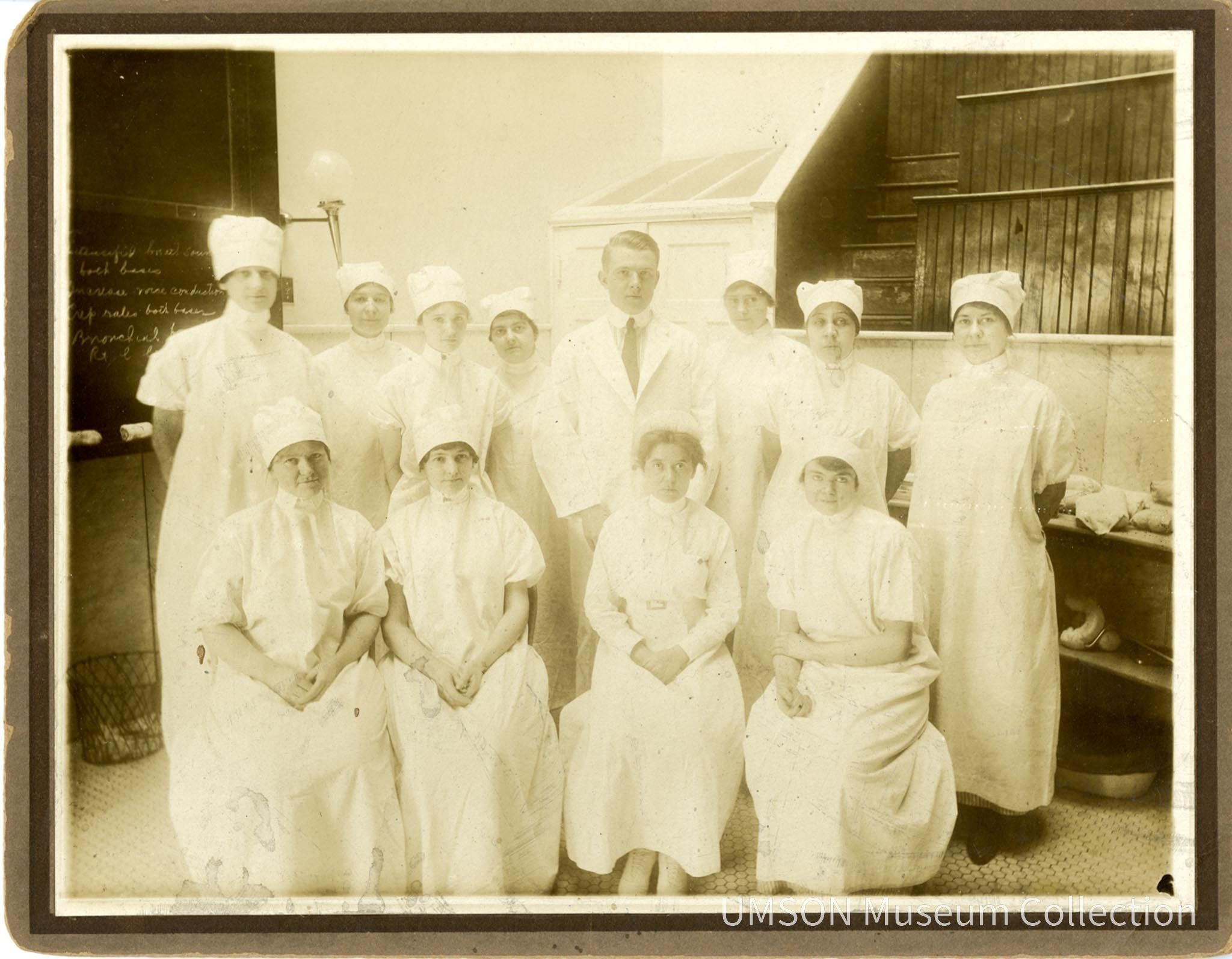 University Hospital Operating Room nurses with supervisor and physician. The nurses wear surgical caps and gowns, while the supervisor wears a graduate uniform and cap. Front row: Agnes Lohse, DIN 1919; Lena Edna McDaniel, DIN 1918; Helen Carlisle Pleasants, DIN 1918. Back row: Eliza Nordt, DIN 1915; Emma Murray, DIN 1919; Jula L. Foley, DIN 1914; Nellie Flaherty, DIN 1919; Dr. Charles Reifschneider; Helen Gordy, DIN 1919; Ruth Yingling, DIN 1918; Mercedes Brown, DIN 1919.Photograph Details