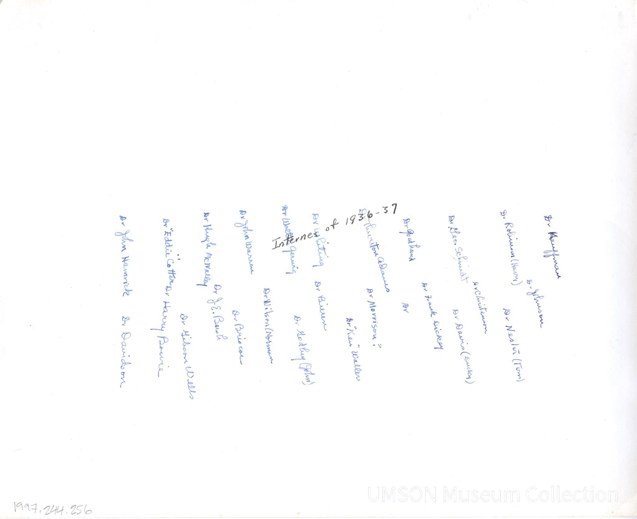 Dr. Kauffman, Dr. Johnson, Dr. Robinson (Harry), Dr. Nestor (Tom), Dr. Christeman, Dr. Geo. Schmidt, Dr. Davis (Duckey), Dr. Goodhand, Dr. Frank Dickey, Dr. Thurston Adams, Dr. ---, Dr. Morrison?, Dr. "Ken" Waller, Dr. Whiting, Dr. Bieren, Dr. Walter Gerwig, Dr. Godfrey (John), Dr. Wilson (Norman), Dr. John Warren, Dr. Briscoe, Dr. J.E. Bush, Dr. Hugh McNally, Dr. Gibson Wells, Dr. Eddie Cotter, Dr. Harry Bowie, Dr. John Hamrick, Dr. Davidson.Language