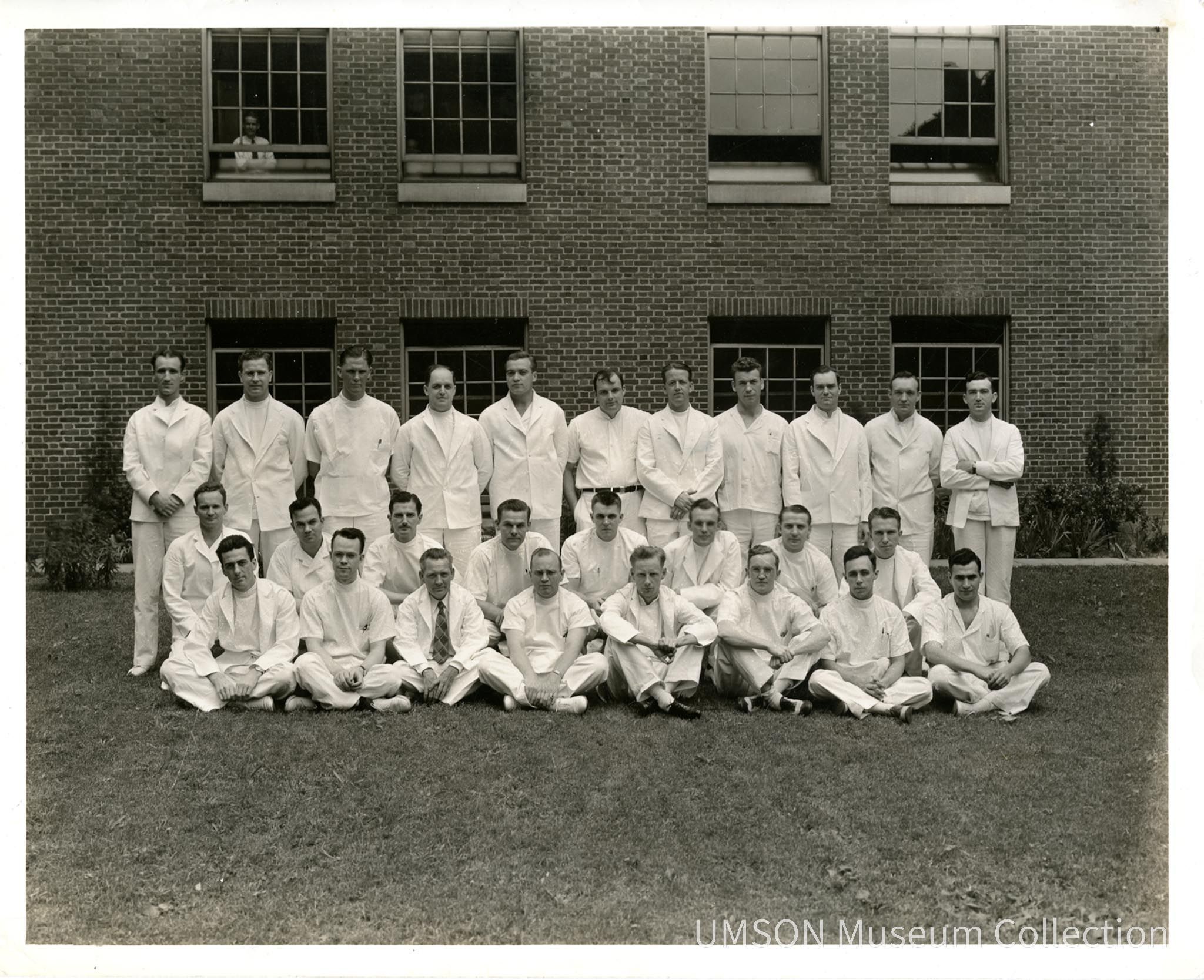 27 men in three rows in front of a brick building with open windows. Identified on back: Dr. Kauffman, Dr. Johnson, Dr. Robinson (Harry), Dr. Nestor (Tom), Dr. Christeman, Dr. Geo. Schmidt, Dr. Davis (Duckey), Dr. Goodhand, Dr. Frank Dickey, Dr. Thurston Adams, Dr. ---, Dr. Morrison?, Dr. "Ken" Waller, Dr. Whiting, Dr. Bieren, Dr. Walter Gerwig, Dr. Godfrey (John), Dr. Wilson (Norman), Dr. John Warren, Dr. Briscoe, Dr. J.E. Bush, Dr. Hugh McNally, Dr. Gibson Wells, Dr. Eddie Cotter, Dr. Harry Bowie, Dr. John Hamrick, Dr. Davidson.Photograph Details