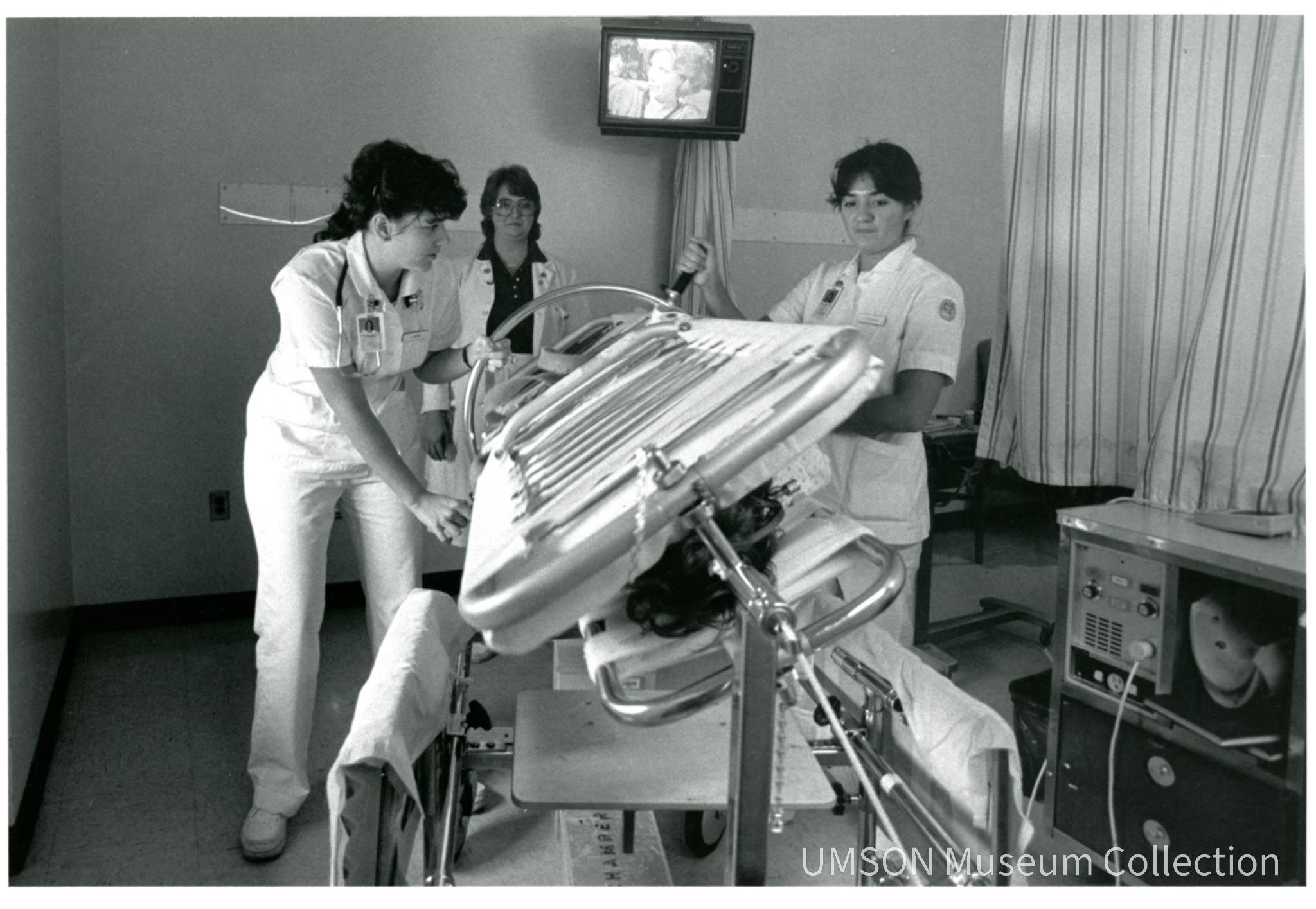 Nursing students turning a patient in a Stryker frame while a supervisor watches, University of Maryland Medical CenterEntry/Object ID