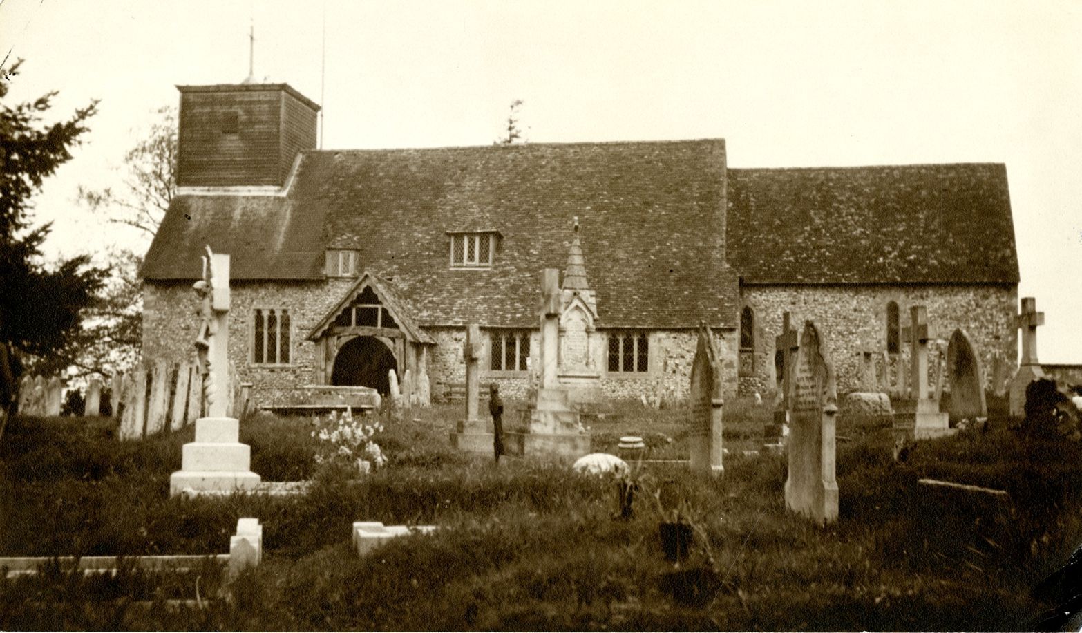 Photograph of St. Mary of Antioch churchyard, grave and memorial to Florence Nightingale at center rear. Side view of stone church; Nightingale's memorial is a tall, white marble obelisk.Photograph Details